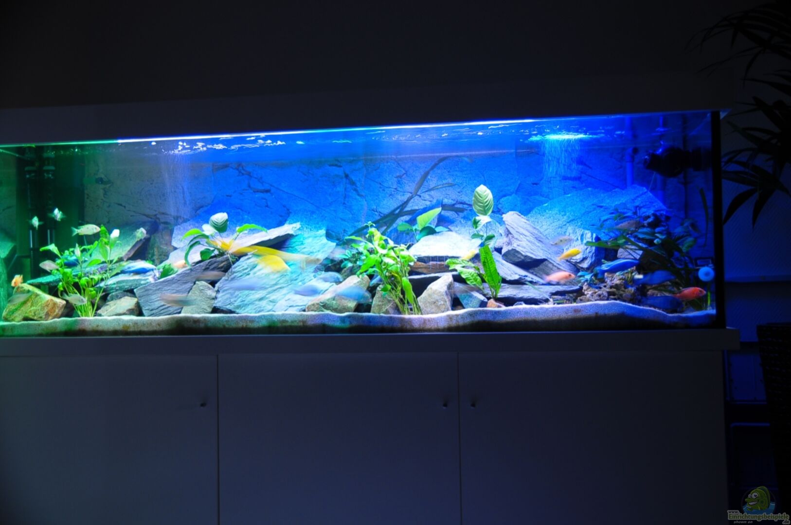 Beleuchtung : 2 T8 Röhren, die vordere Röhre ist eine Aqua-Glo der Firma Hagen.Die hintere Röhre ebenfalls.Beide Röhren sind mit Alufolie abgedunkelt und zum Teil mit blauer und grüner Folie umwickelt.Beide Röhren haben 36 watt. Aquarium: 12mm Sicherheitsverglasung sowie Verklebung. Bodenbereich 2 Bohrungen für Pumpensystem. Bodenplatte habe ich eine 20mm Styrodurplatte eingelegt für den Steinaufbau Da wir gerade ein Haus gekauft haben, wollten wir es dem Wohnzimmer anpassen. Wei?? [...]