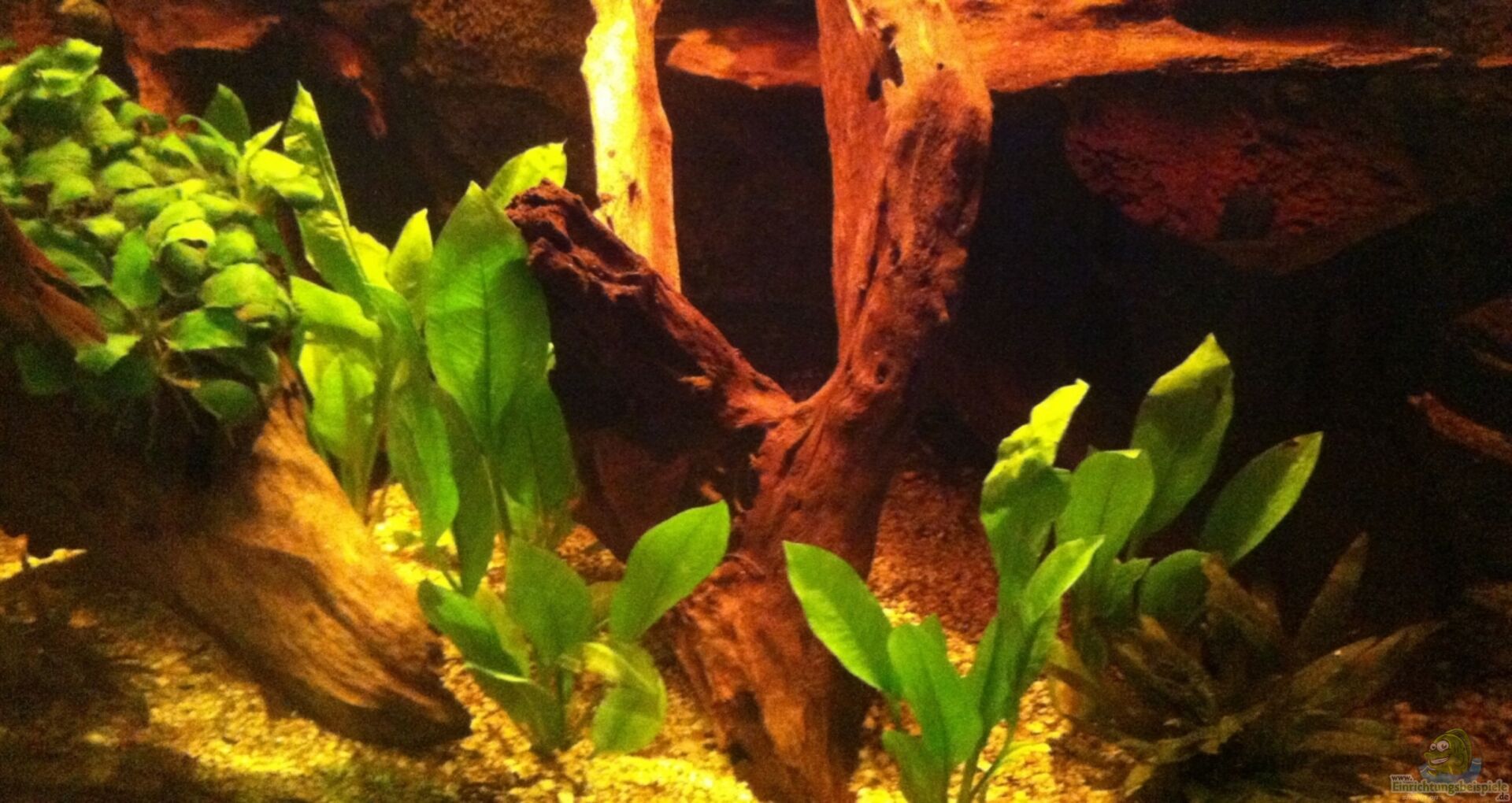 - Vallisneria spiralis (Glattblättrige Sumpfschraube) links im Hintergrund. Bild 1 - Echinodorus (Schwertpflanze) mittig links. Bild 4 - Anubias barteri (Breitblättriges Speerblatt) auf einem relativ flachen Stück Mangrove. Bild 3 - Anubias barteri nana (Zwergspeerblatt) mittig auf Mangrove. Bild 5 - Echinodorus bleherae (Schwertpflanze). Bild 5 - Cryptocoryne miOya (Brauner Wasserkelch). Bild 6