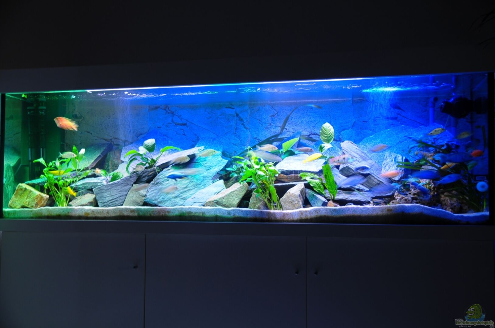 Beleuchtung : 2 T8 Röhren, die vordere Röhre ist eine Aqua-Glo der Firma Hagen.Die hintere Röhre ebenfalls.Beide Röhren sind mit Alufolie abgedunkelt und zum Teil mit blauer und grüner Folie umwickelt.Beide Röhren haben 36 watt. Aquarium: 12mm Sicherheitsverglasung sowie Verklebung. Bodenbereich 2 Bohrungen für Pumpensystem. Bodenplatte habe ich eine 20mm Styrodurplatte eingelegt für den Steinaufbau Da wir gerade ein Haus gekauft haben, wollten wir es dem Wohnzimmer anpassen. Wei?? [...]