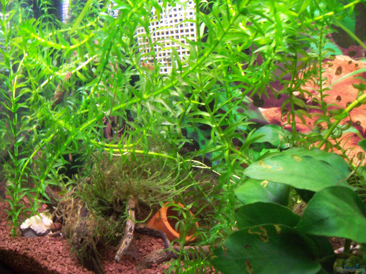 -> mehrere verschieden gro??e Regenbogensteine verteilt im gesamten Becken -> eine halbe Kokosnuss- Schale im rechten Bereich des Beckens -> eine gro??e Wurtzel die den linken Bereich des Beckens einnimmt und derzeit vom Javamoos überwuchert wird