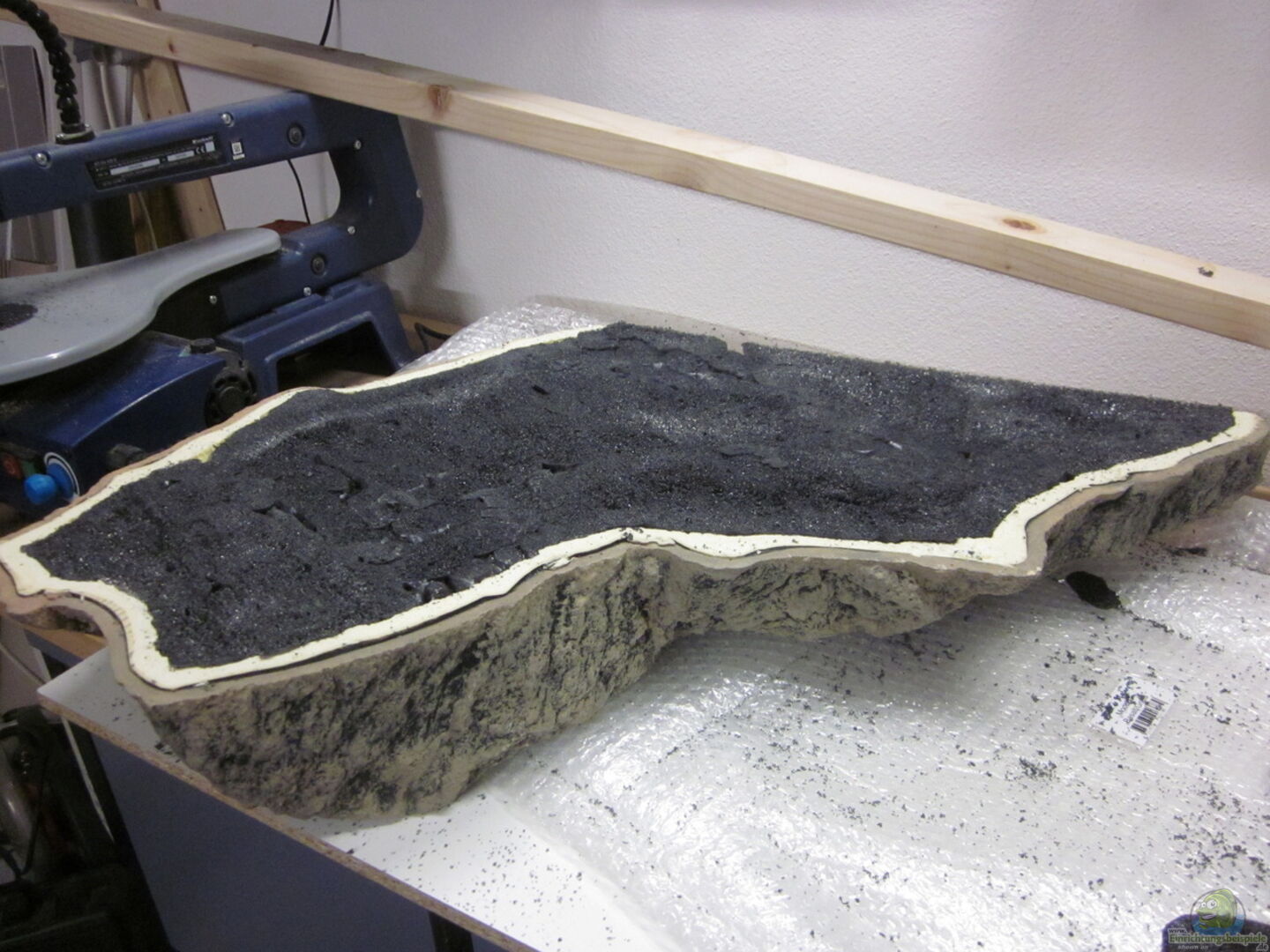 Das Becken wurde mit schwarzer Folien beklebt und es Wurden 2 Module von "Back to Nature" eingesetzt. Diese Module wurden mit Brunnenschaum ausgeschäumt um tote Stellen zu vermeiden. Ferner sind noch 2 wurzeln drin...