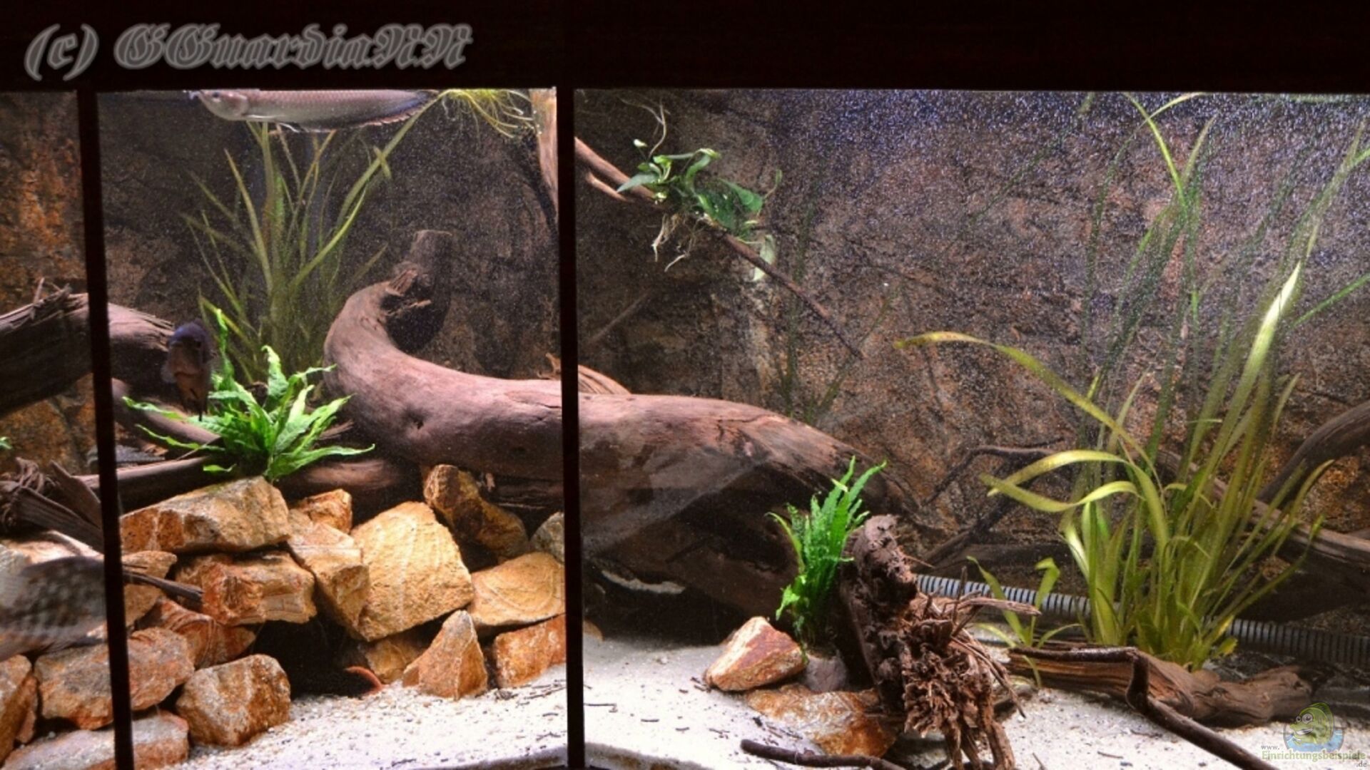 Das Aquarium: Das Becken ist von seinen Ma??en und seiner Form komplett selbst geplant. Es wurde von meinem Bruder Oliver und mir selbst vor Ort verklebt, die Glasstärke beträgt 12 mm (reicht für eine Höhe von 75 cm, ca. 14, 7 qm Float-Glas), dank der sehr sauberen Schnittkanten musste das Glas nicht geschliffen werden, die Kanten wurden mit einem Schleifschwamm nur leicht gebrochen. Es ist mit schwarzem Silikon auf Stoss verklebt, die Schräge vorne ist wulstverklebt, innen hat es rundherum [...]