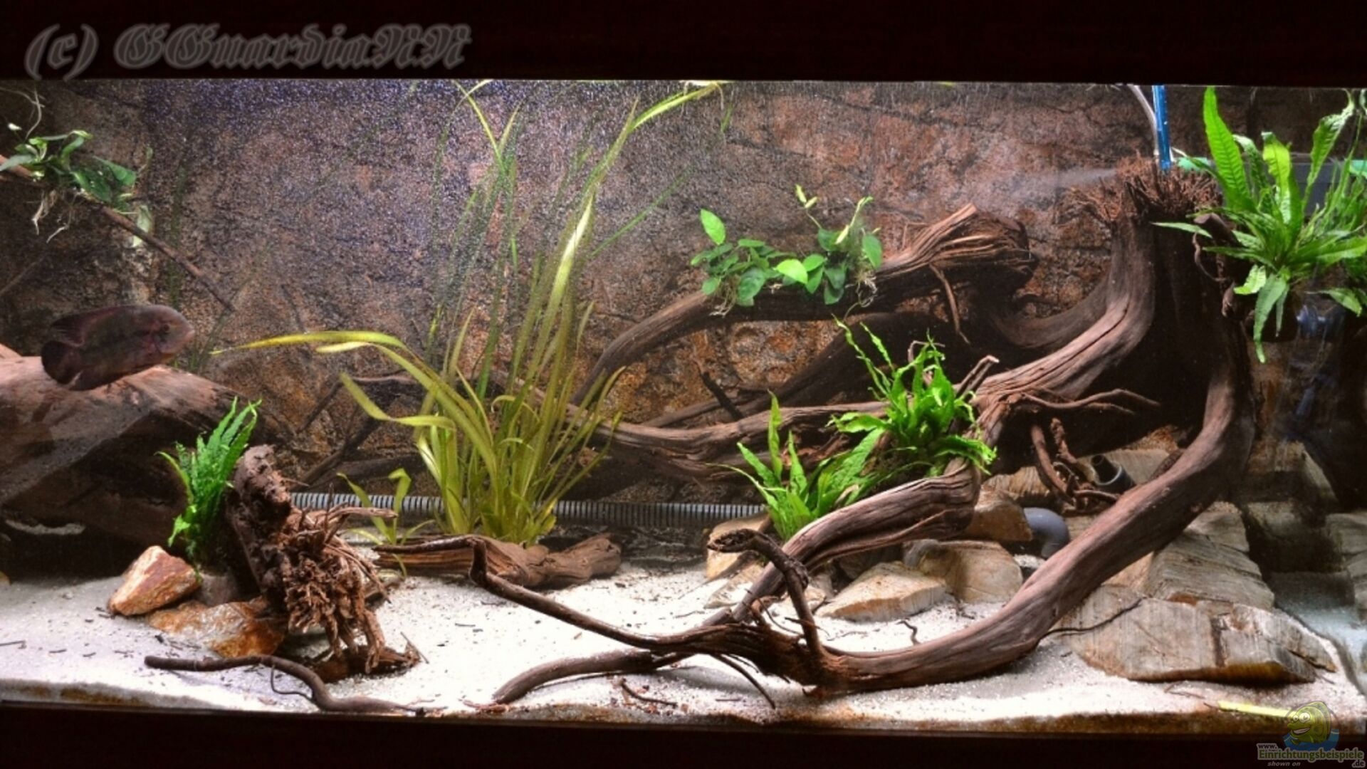 Das Aquarium: Das Becken ist von seinen Ma??en und seiner Form komplett selbst geplant. Es wurde von meinem Bruder Oliver und mir selbst vor Ort verklebt, die Glasstärke beträgt 12 mm (reicht für eine Höhe von 75 cm, ca. 14, 7 qm Float-Glas), dank der sehr sauberen Schnittkanten musste das Glas nicht geschliffen werden, die Kanten wurden mit einem Schleifschwamm nur leicht gebrochen. Es ist mit schwarzem Silikon auf Stoss verklebt, die Schräge vorne ist wulstverklebt, innen hat es rundherum [...]