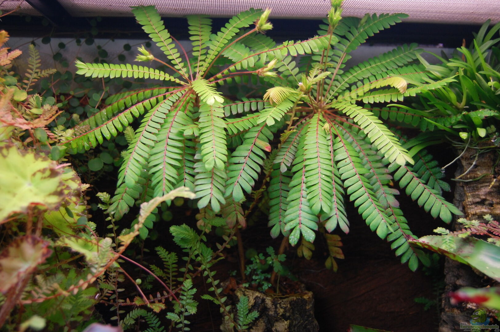 Schwimmpflanzen: Lemna minor, Limnobium laevigatum Wasserpflanzen: Ceratophyllum demersum, Echinodorus x Regine Hildebrandt, Anubias barteri Nana, Acorus gramineus Moose: Riccia fluitans, Taxiphyllum barbieri, Monosolenium tenerum Landpflanzen: Barbosella cucullata, Biophytum sensitivum, Begonia bowerae, Episcia dianthiflora, Ficus scandens, Neoregelia fireball, Neoregelia pauciflora, Neoregelia Red spottet, Peperomia, Ficus borneo, Selanginella spec, Ficus quercifolia