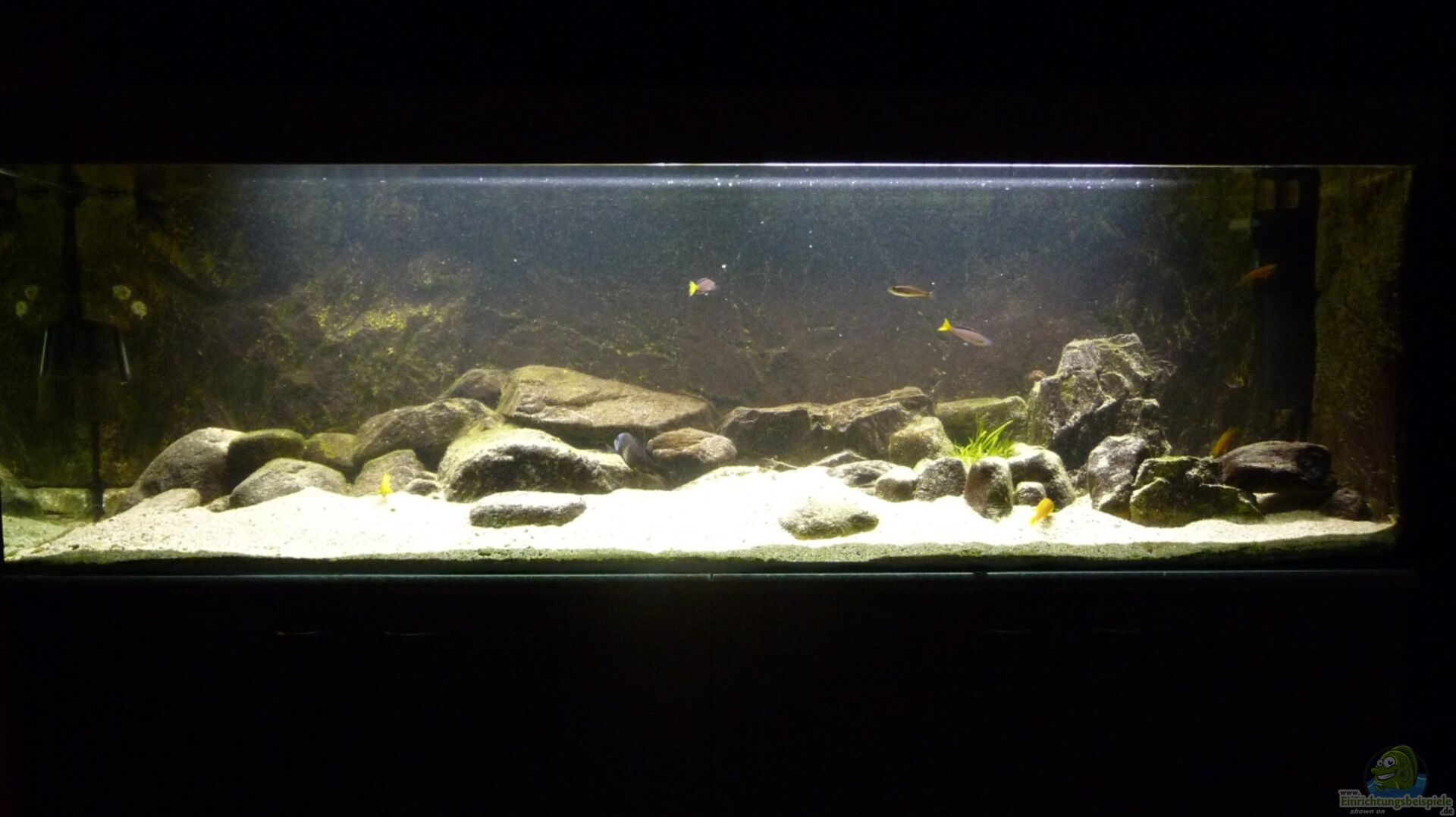 Standardbecken, sto??verklebt. Unterschrank und Abdeckung in Bucheoptik. Die Bodenscheibe ist von innen zum Schutz mit 1 cm Styropor beklebt (das Aquarium war früher mal ein Tanganjikabecken mit vielen Steinaufbauten). Auch das Becken selbst steht auf einer 1 cm Styropor-Schicht. Um die Standfläche der ganzen Kombination etwas zu vergrö??ern, steht der Unterschrank auf einer Arbeitsplatte. Damit soll die Last ein wenig gleichmä??iger auf dem Fu??boden verteilt werden.