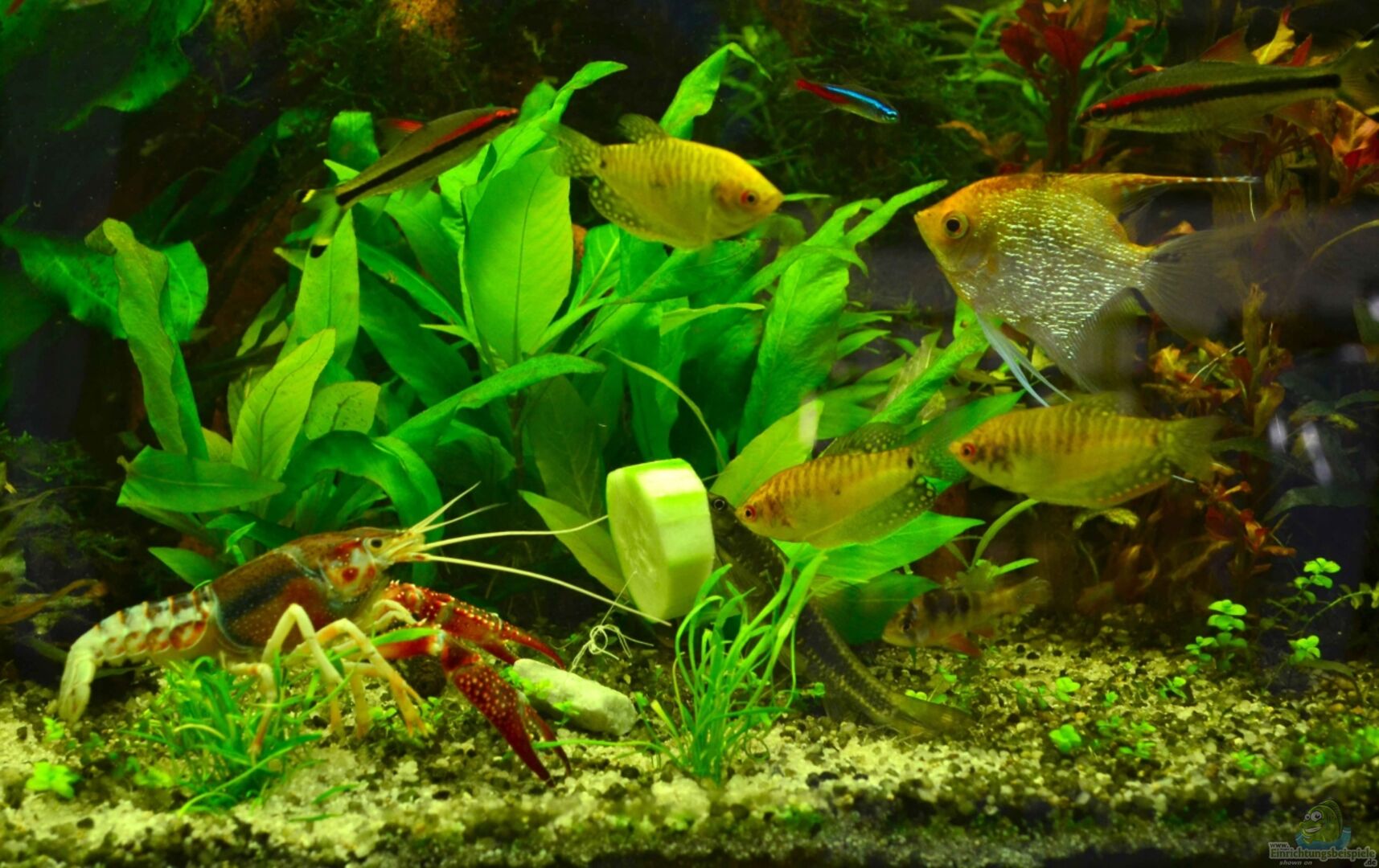 2 Antennenwels L134 8 Rostpanzerwelse 6 Julipanzerwelse 2 Superalgenfresser 3 Goldschmerlen Flusskrebs (Procambarus clarkii Ghost) 2 Goldene Gurami 2 Blaue Fadenfische 4 Mosaikfadenfische 2 gro??e Skalare 2 kleine Skalare 6 Rotstreifenfische (od. auch Torpedofisch genannt) 20 Keilfleckbärblinge 15 Neons ca 40 Raubschnecken