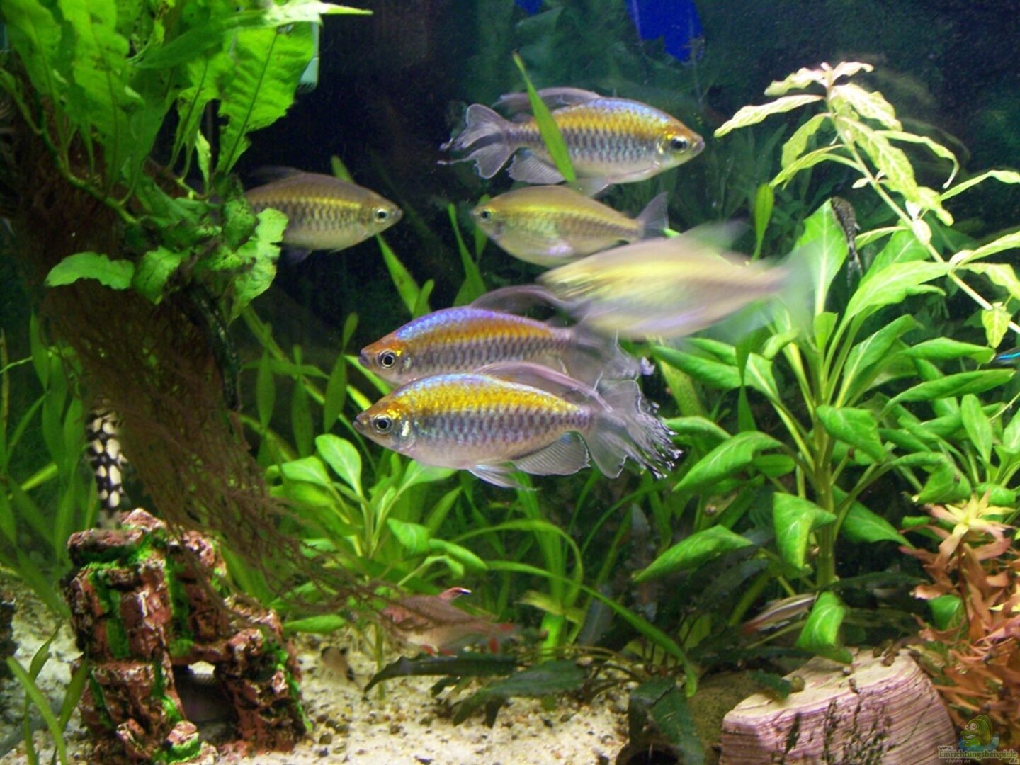 4 Segelflosser (Pterophyllum scalare) 8 Blaue Kongosalmler (4 M/4W) 5 Schmucksalmler (Hyphessobrycon bentosi bentosi) Rest von ursprünglich 10 6 Welse (ein Pärchen L 144, ein Pärchen braune Antennenwelse, zwei Panaquolus maccus) 7 Panzerwelse (vier Panda-Panzerwelse, drei Schachbrettpanzerwelse) 2 Maroni-Buntbarsche (ein Pärchen) 2 Borellis Zwergbuntbarsche (ein Pärchen) 3 Netzschmerlen (Botia lohachata) Au??erdem sind noch vier blaue Neons, zwei Feuersalmler, drei Kardinalfische, [...]