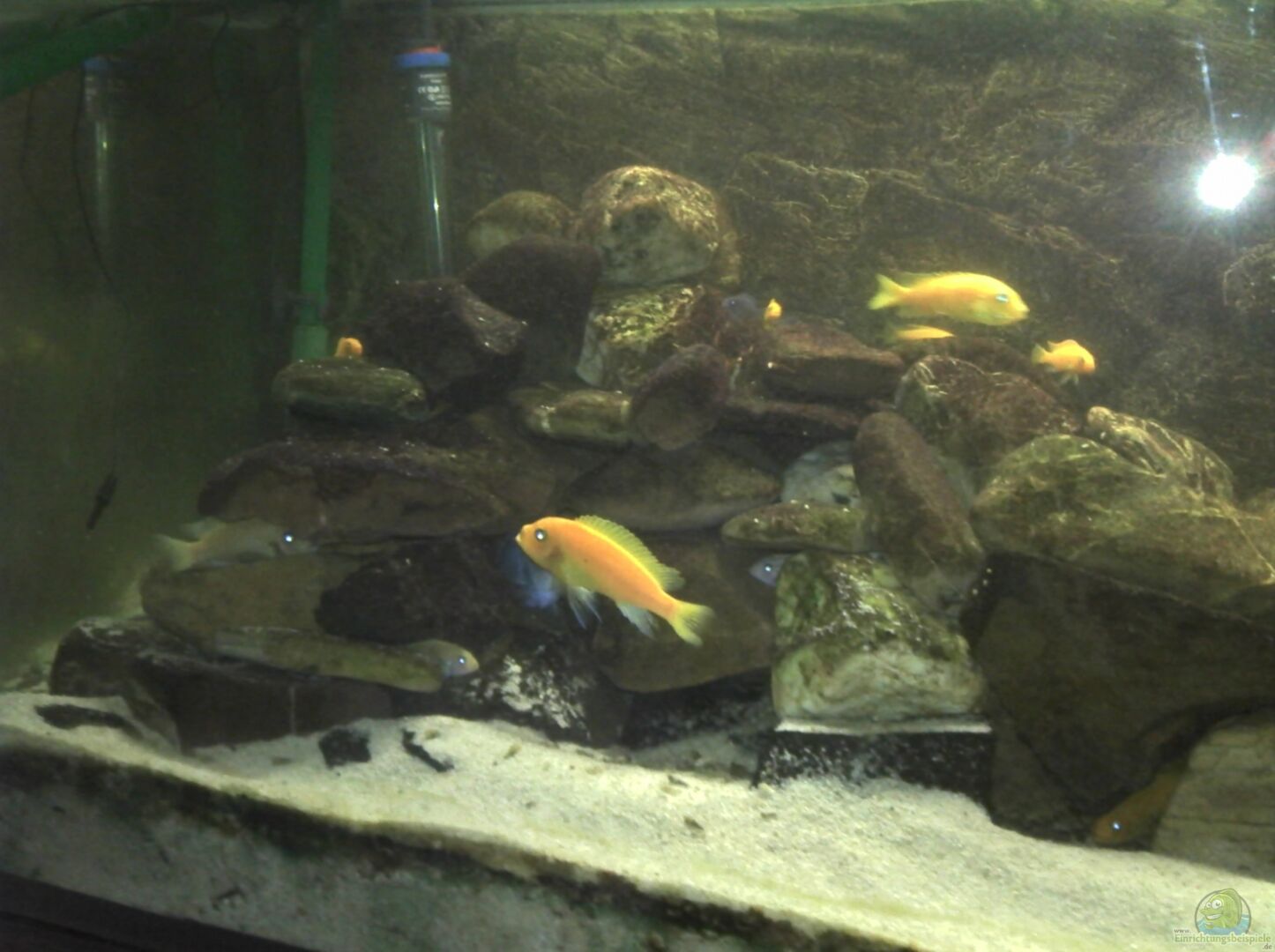 Dieses Aquarium hat eine 3D-Rückwand hinten. Ich hätte gerne noch eine für die linke Seite, welche ja nun an der Wand steht. Aber das wird sicher noch eine Weile dauern. Die Steinaufbauten aus Flu??steinen dienen den Fischen als Verstecke. Unter den Steinen liegt eine Styroporplatte zum Schutz des Glases, sie können auch nicht unterbuddelt werden, so da?? nichts einstürzen kann.