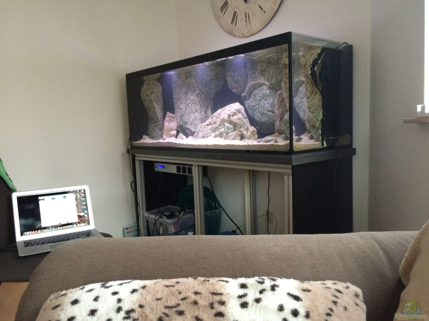 Becken aus 10mm Floatglas von JEKO-Aquaristik. Das Becken ist dreiseitig mit opaker Folie in schwarz matt beklebt. Rechte Seitenscheibe teilweise Kontur ausgeschnitten. Abgedeckt mit 4 Stück 4mm Scheiben. Jeweils rechts & links vom Mittelsteg 2 Stück die in schwarzen E-Profilen geführt werden. Diese liegen auf den längs verklebten Stegen. Somit kann ich die Abdeckscheiben relativ einfach bewegen - quasi Schiebetüren als Abdeckung. Unterbau besteht aus 45mm Alu-Profilen von Aluprofiltechnik [...]