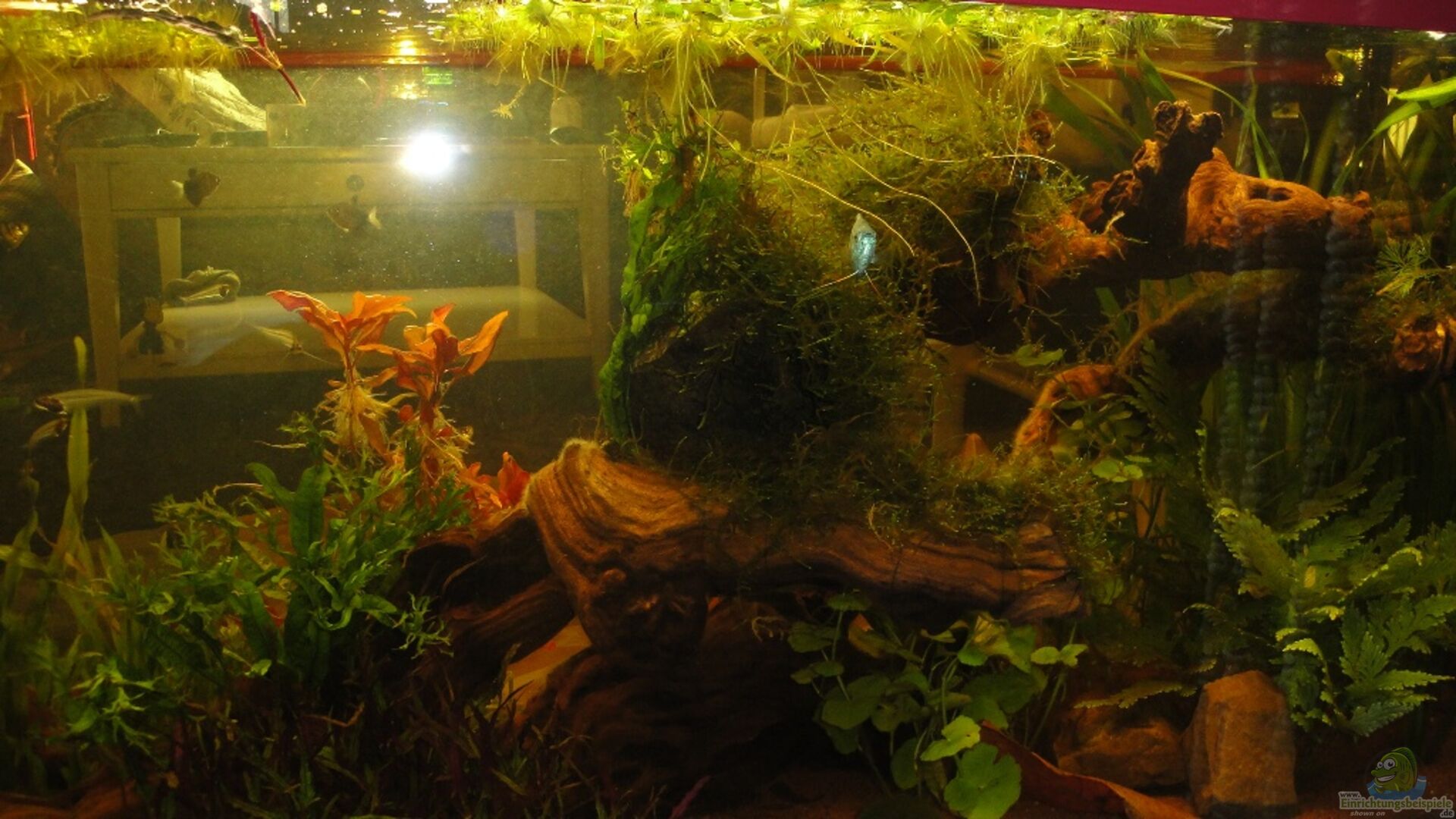 Das Becken steht ohne Unterschrank direkt auf dem Fu??oden (naürlich auf einem dämmendem Unterbau bestehend aus einer 30mm mdf-Platte und 30mm Holzfaserdämmwolle). Das ganze wurde mit Sockelleisten passend zum Dielenboden verkleidet. Das Becken dient als Raumtrenner. Die an der Wand stehende kurze Seite ist schwarz abgeklebt. Die Fische haben durch den groszügigen Wurzelaufbau und die dichte Bepflanzung reichlich Rückzugsmöglichkeiten.