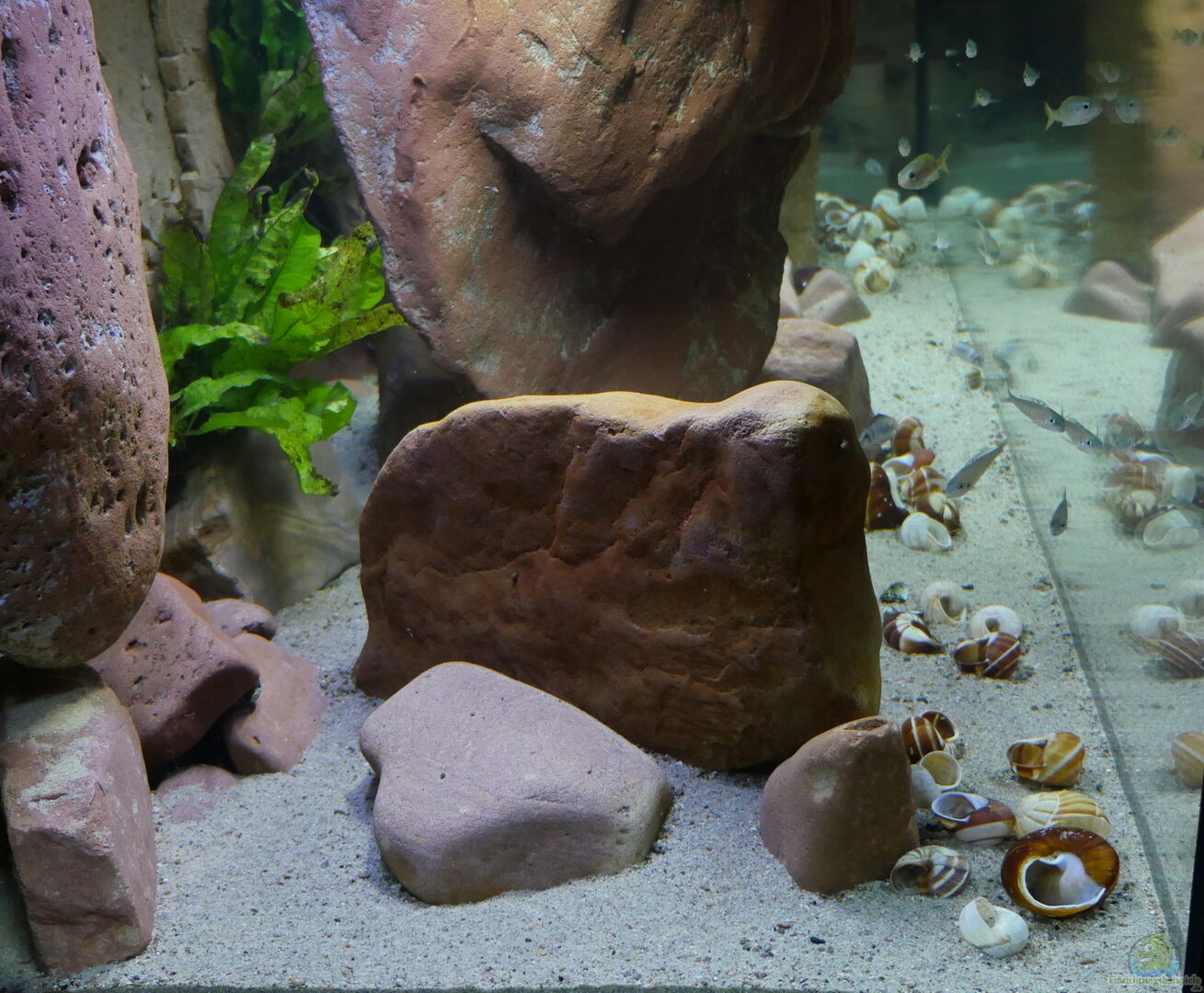 Standardbecken der Firma Aquarienkontor aus Haltern am See - Glasstärke 12 mm, Front- und Seitenscheiben aus Wei??glas - Unterbau aus Aluminiumprofilen mit Scherwänden aus 15mm starken Siebdruckplatten - Eingeklebte Back to nature Slimline Red Gneis Rückwand. Ziel des Projekts war es, steile Felswände (Rückwand und hängende Felsmodule) als Lebensraum für Cyprichromis sowie eine durch stehende Felsen gut gegliederte (Reviergrenzen), sandreiche ??bergangszone nachzubilden, in der sich [...]