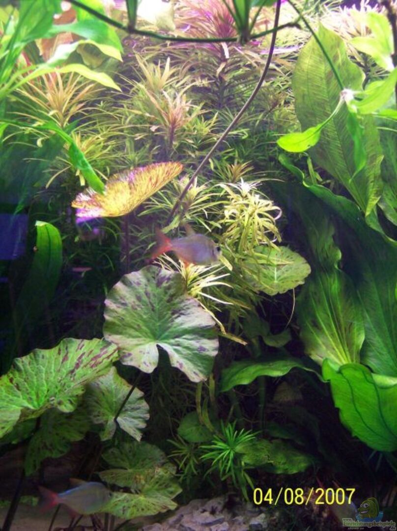 Vordergrund: ??? Eleocharis parvula ??? Hemianthus callitrichoides `Cuba´ (Probe, langsam anwachsend) ??? Hemianthus micranthemoides (bleibt schön gedrungen!) ??? Lilaeopsis brasiliensis (Probe, relativ dunkels Laub) ??? Sagittaria subulata (nach Anwachsphase stark ausbreitend, ähnlich Vallesneria) Mittelgrund: ??? Cryptocoryne beckettii "petchii" (Art nicht sicher, schöne Wuchsform) ??? Echinodorus bleheri (zur Zeitnur wieder in klein, da eigene Ableger, Mutterpflanzen [...]