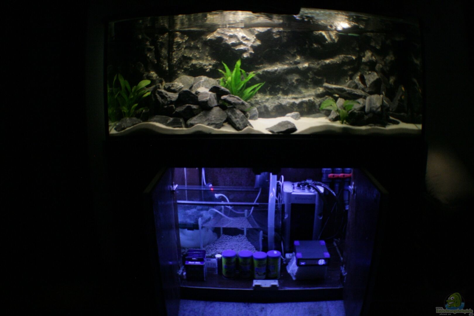 -In der Rückwand befindet sich eine fix eingebaute USB-Endoskopkamera. Diese diente anfangs nur um das Aquarium mal aus der "Fischperspektive" anzusehen und evtl. Verbesserungen vorzunehmen. Mittlerweile finde ich, ist es eine gute Möglichkeit die Fische zu beobachten ohne sie dabei zu stören indem ich an der Aquariumscheibe klebe. -Im Bio 4-Kammerfilter ist ein Lüfterstein eingelegt um zusätzlich co² auszutreiben. Sowie ein 300Watt Regelheizer von Tetra um die Temperatur zu [...]