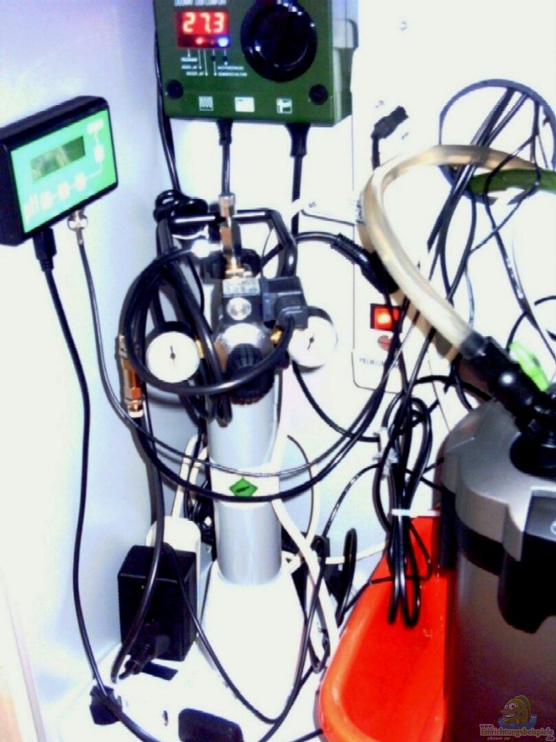 Bodenfluter von JBL ProTemp 250 und Regelheizer 150 Watt- beide sind an einem DENNERLE Digital DUOMAT 1200 Comfort angeschlossen, Co2 Anlage von Aquamas mit 500g Flasche und Magnetventil, geregelt über einem digitalen Ph Regler,
