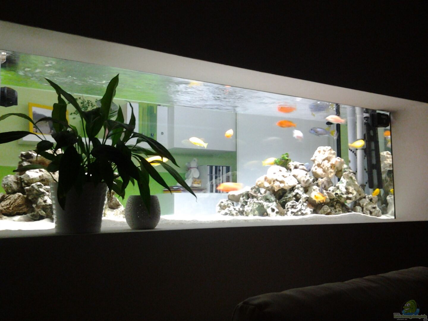 Wandaquarium zwischen Wohnzimmer und Büro Unterbau: Das Becken selbst ruht auf einen gemauerten und verputzen Y-Tong Unterbau welcher zusätzlich als Regal dient und dem Raum angepasst ist. Wasseranschlüsse w/k sowie kleines Waschbecken sind zusätzlich integriert. (Eimer schleppen gehören der Vergangenheit an) Beckenabdeckung aus 5mm Acrylglasplatten
