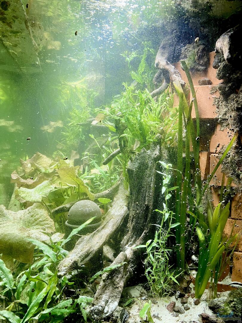Rückwand und Terrassierungen sind aus Ziegelsteinen/Backsteinen gestaltet. Diverse Holzarten, darunter sehr gro??es Moorkienholz (alt und gewässert, hat keinen Einfluss mehr auf das Wasser), aber auch einheimische Hölzer wie Apfelbaum, Buche, Eiche, Hainbuche.