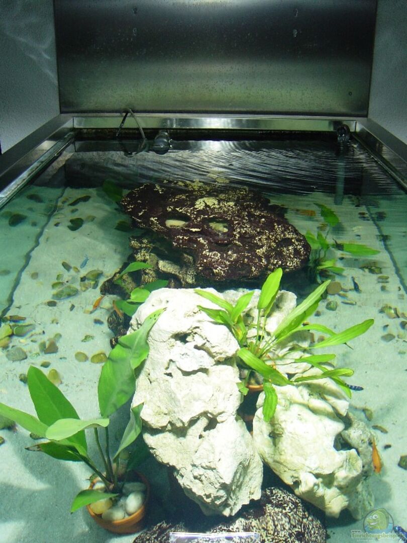 Das Aquarium ist eine Sonderanfertigung und dient als Raumteiler. Der obere Rand des Beckens ist mit einem V4A Edelstahrahmen eingefasst. Als ich 1998 mein Haus baute wurde alles gleich mit eingeplant. Das Becken ist gebohrt und am Hausabfluss und Hauswasseranschluss über eine Thermostatbatterie angeschlossen. Der Schrank ist gemauert und verklingert. ??ber eine Edelstahlklappe ist die Technik zu erreichen.