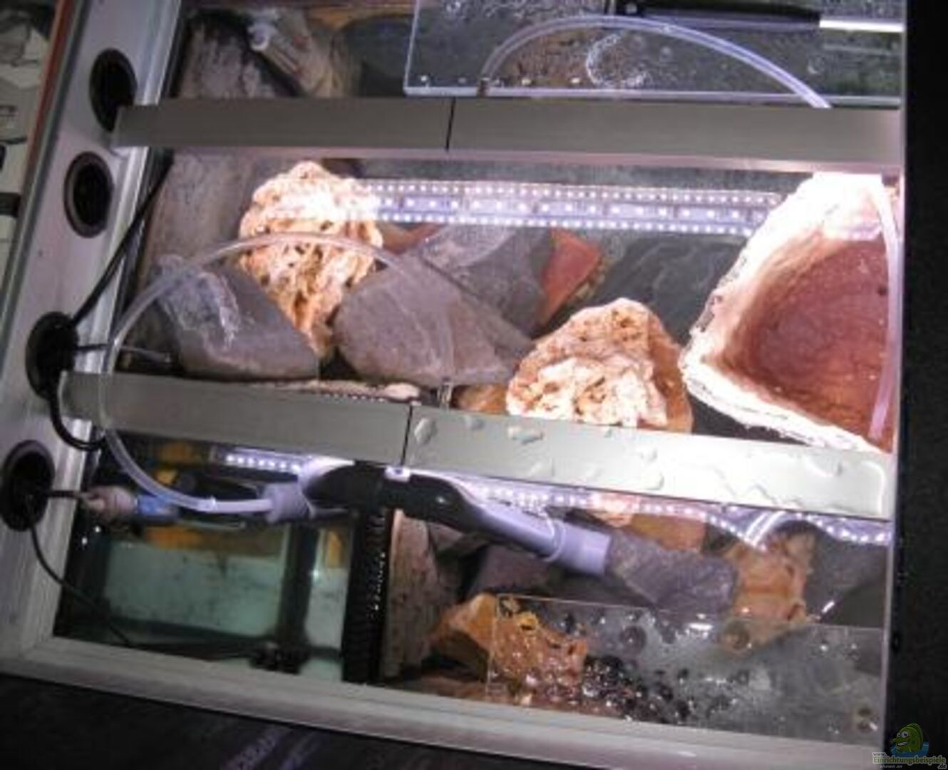 Tunze 6045 Strömungspumpe (4500L/Std) mit nanostream rock verkleidet. Eingebaut in den Felsenaufbau (rechts im Becken). Habe an die Flügel des nanostream Rock Schaumstoff (mit Hei??kleber) angebracht, damit keine Vibrationen an das Becken, über die Steine bzw. die Rückwand, abgegeben werden können. Funktioniert gut. Man hört die Pumpe nicht. Läuft von 10:00-13:00 Uhr und von 15:00-20:00 Uhr (über Zeitschaltuhr).