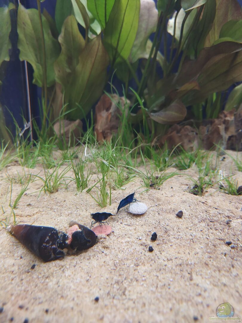 Garnelen: 15x Neocaridina Davidi var. 'Blue Carbon Rili" Schnecken: 4x Neritina (Vittina) semiconica - Orange Tracks Rennschnecke 4x Taunus aber - Cappuccino Schnecke 4x Zebrarennschnecke Fische: 1x m / 2x w Zwergfadenfisch 13x Perlhuhnbärblinge Weiterhin geplant: Dornaugen