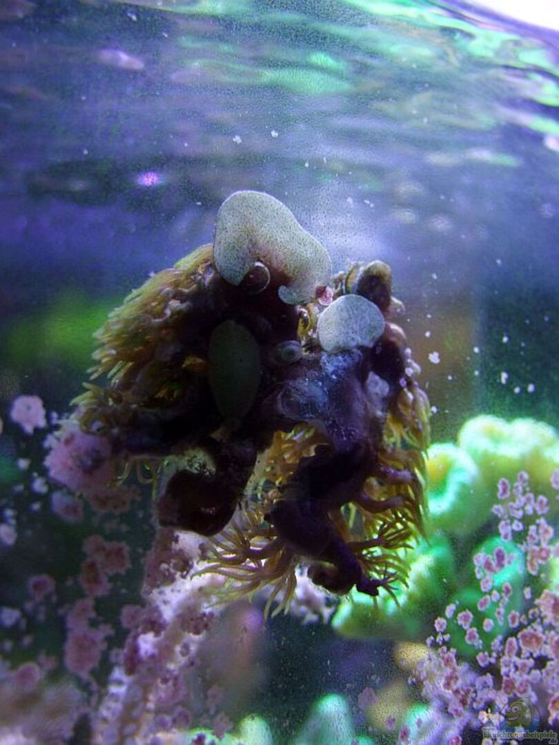 Korallen: * Zoanthus sp., unterschiedliche Färbungen. Erst nach dem zweiten Versuch klappte das Einbringen! Beim ersten mal wunderte ich mich, dass die Polypen nach und nach verschwanden... bis ich eine Heliacos-Schnecke absammelte und vor allem die dunkelgrauen Asterinas mehrfach beim gemütlichen Mampfen erwischte. Ich war mir nicht sicher, ob die kleinen Seesternchen nicht einfach nur die Gunst der Stunde nutzten und das Werk der Schnecke vollendeten- sprich, nur an bereits angeschlagenen Polypen [...]