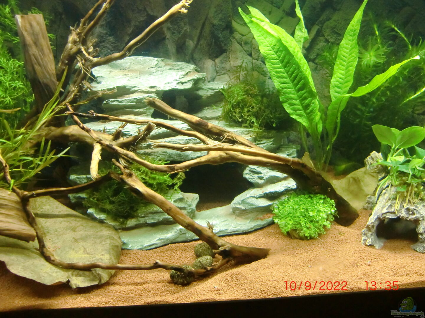 1x Garnelenbrücke von Hobby aus Kunststoff 1x Garnelenhöhle von Hygger aus Kunststoff 1x 3er Garnelenhöhle mehrere Fingerwurzeln Natur in verschiedenen Grö??en Seemandelblätter Bananenblätter Erlenzapfen eine kleine Schieferplatte unter der Futterstelle, damit das Futter nicht im Boden versinkt 1x Garnelenball, ca. 8cm Durchmesser