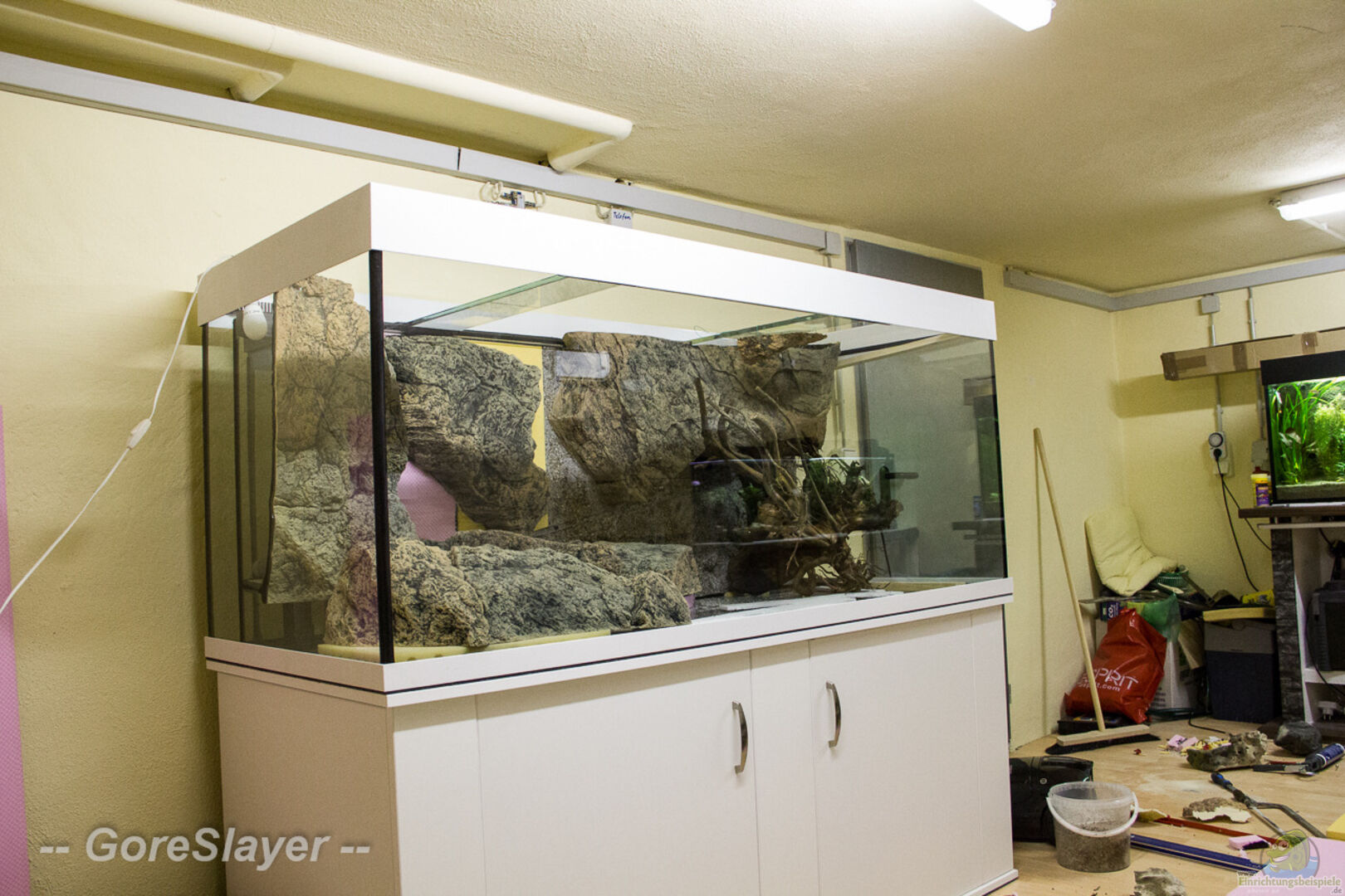 Das Aquarium ist vom Typ: Rechteck und steht im Keller auf einem ProfiLine Stahlschrank (180 x 70 x 74) mit 2 Türen, welche mit einem Softeinzug ausgestattet sind, um Erschütterungen zu vermeiden. Das Schrankdekor, die ABS-Kanten, die Kiesblende sowie die Abdeckung sind in Weiss gewählt wurden. Für die Türgriffe wurde der Typ - Dinia benutzt. Zwischen Becken und Schrank sowie Schrank und Untergrund befinden sich zwei Filz Sicherheitsauflagen. Das Becken ist aus 12mm Floatglas aufgebaut [...]