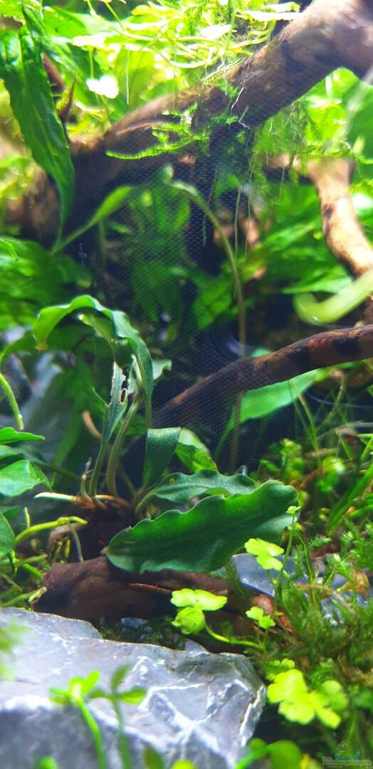 Vordergrund/Entlang der Steine: Eleocharis pusilla und Marsilea hirsuta. Auf Holz und zwischen den Steinen: Hydrocotyle cf. tripartita (wächst immer auf/mit Moosen zusammen), Bucephalandra sp. green, Javafarn "narrow" (Microsorum pteropu), Anubias Bonsai, Christmasmoss(Vesicularia montagnei) Taxiphyllum 'Spiky und vereinzelt Korallenmoos - riccardia chamedryfolia. Im Hintergrund: Hygrophila pinnatifida und im Schatten Cryptocoryne x wilisii und eine unbekannte Cryptocoryne [...]