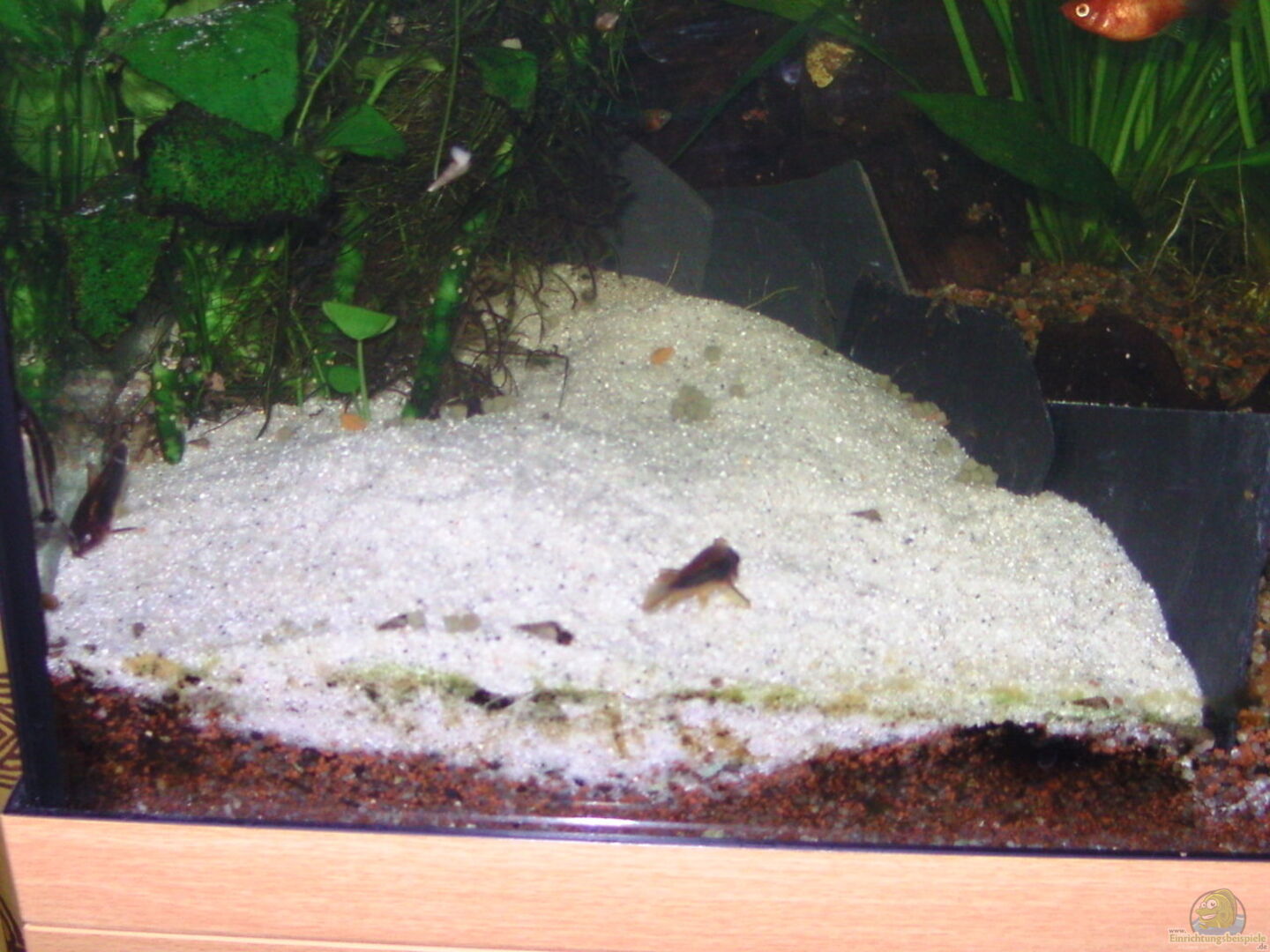 1 Siamesische Rüsselbarben, 7 Ohrgitterharnischwelse, 1 Anicstrus Männchen, ca., 8 Rotkopfsalmler 6 Metallpanzerwelse 2 Militärhelmschnecken ... und jede Menge Turmdeckelschnecken grrrrr!!!! Platys keine mehr vorhanden---Garbungarnele verstorben ;-((( Ohrgitter werden wieder aufgestockt