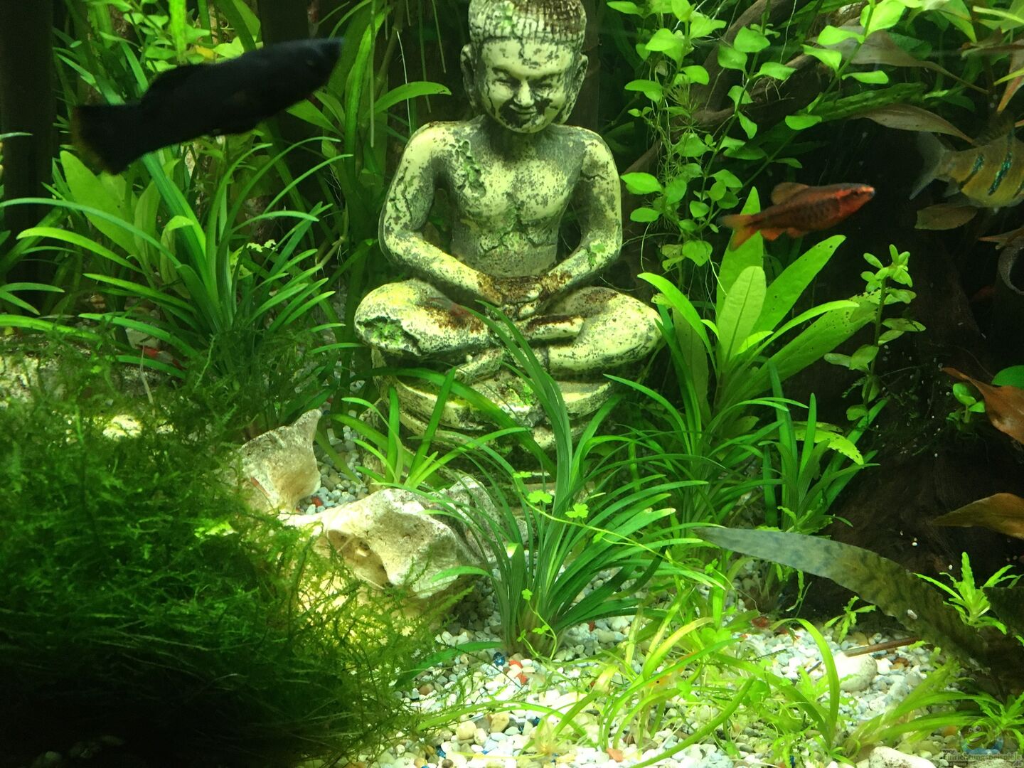 Bambusröhrchen Moorkienwurzeln Baumstumpf Echtholz Stehende Wurzel künstlich Buddha (eine Idee von meiner Frau) daher die Stil und Besatzrichtung Asien, anfangs als Südamerikabecken gedacht aber so ist es mir auch recht. Habe den Besatz nach und nach dementsprechend angepasst. Lochstein wei?? klein (nicht ganz glücklich darüber, bleiben nicht lange wei??)