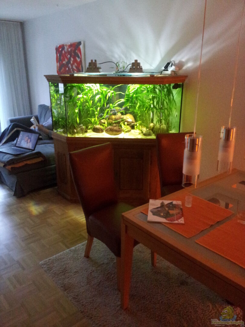 Ehemaliges Meerwasser Aquarium. Schenkel Länge jeweils 110 cm. Seitenscheiben je 36 cm, Frontscheibe 106 cm. Höhe 70 cm. Mit einer 50 cm breiten Scheibe wurde im hinteren Bereich diagonal ein Ablauf- / Filterbereich kreiert. In diesem befinden sich zwei Bohrungen für den Ablauf, die aktuell nicht mehr genutzt werden sollen, denn ich möchte ein lautloses Aquarium haben. Im Aquarium befinden sich zwei Zuläufe als 1 1/4 " Zoll PVC Rohre, die ich ebenso nicht mehr nutze.