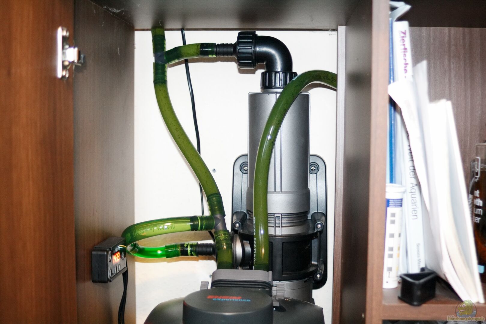 Um das Wasser möglichste frei von Keimen und Algen zu halten, erfolgt auf der Druckseite des Filters ein Bypass an dem ein JBL UV-C Klärer mit 11 Watt Leistung angeschlossen ist. Am Filterauslass befindet ein Diffusor mit dem Umgebungsluft eingeblasen wird. Hierdurch wird auch eine zielgerichtete Strömung erreicht. Heizstab eheim Jäger 150 Watt. Strömungspumpe Tunze Turbella Nano stream 6015 mit 1800 l/h. Das ist meine erste Strömungspumpe, weshalb ich "zum kennenlernen" [...]