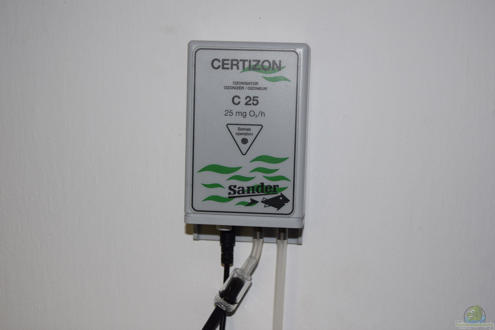 Eheim skim Marine 100 kombiniert mit einer Membranpumpe von Sera; Im laufenden Betrieb kommt hier noch ein Ozonisator von Sander (kleinste Ausführung), gekoppelt mit einer Zeitschaltuhr zum Einsatz. Der Ozonisator läuft 2 Mal am Tag für jeweils 15 Minuten. Um 22.00 Uhr und 4.00 Uhr und ist läuft mit nur 25% Leistung