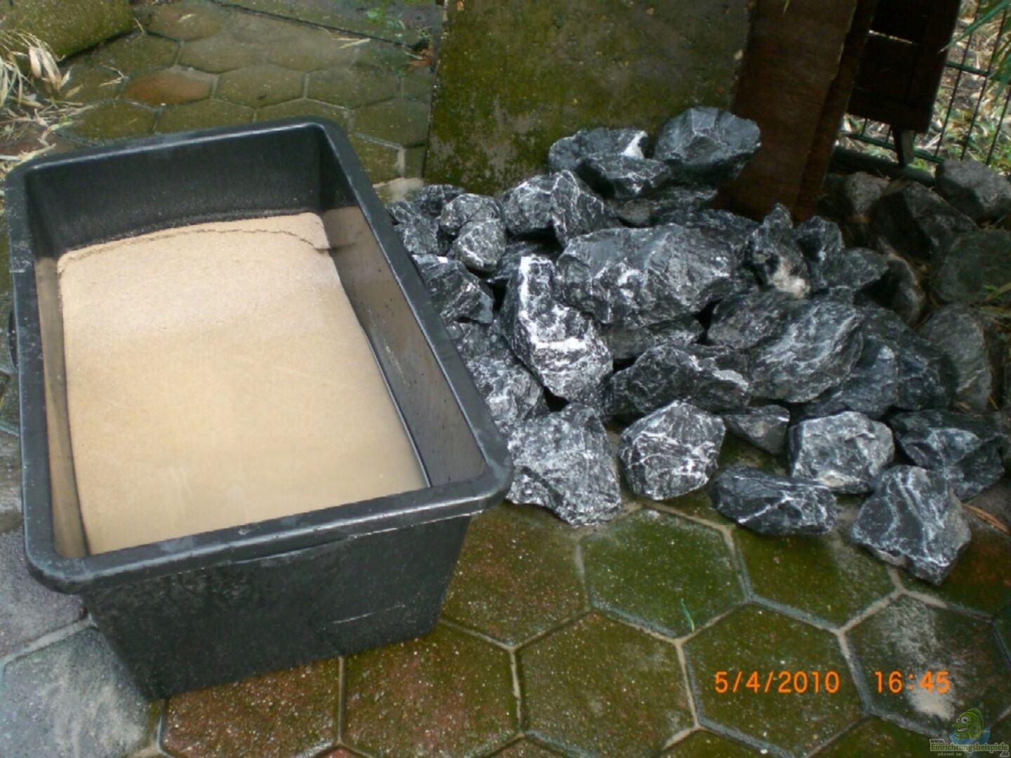 - Rückwand Eigenbau (Styropor + Graniteffektfarbe + Epoxidharz) - ??berhangfelsen, Eigenbau wie Rückwand, mit integrierter Strömungspumpe - Steinaufbauten, ca. 100 kg Ravensburger Sandstein, anthrazitfarben mit wei??en Einschlüssen