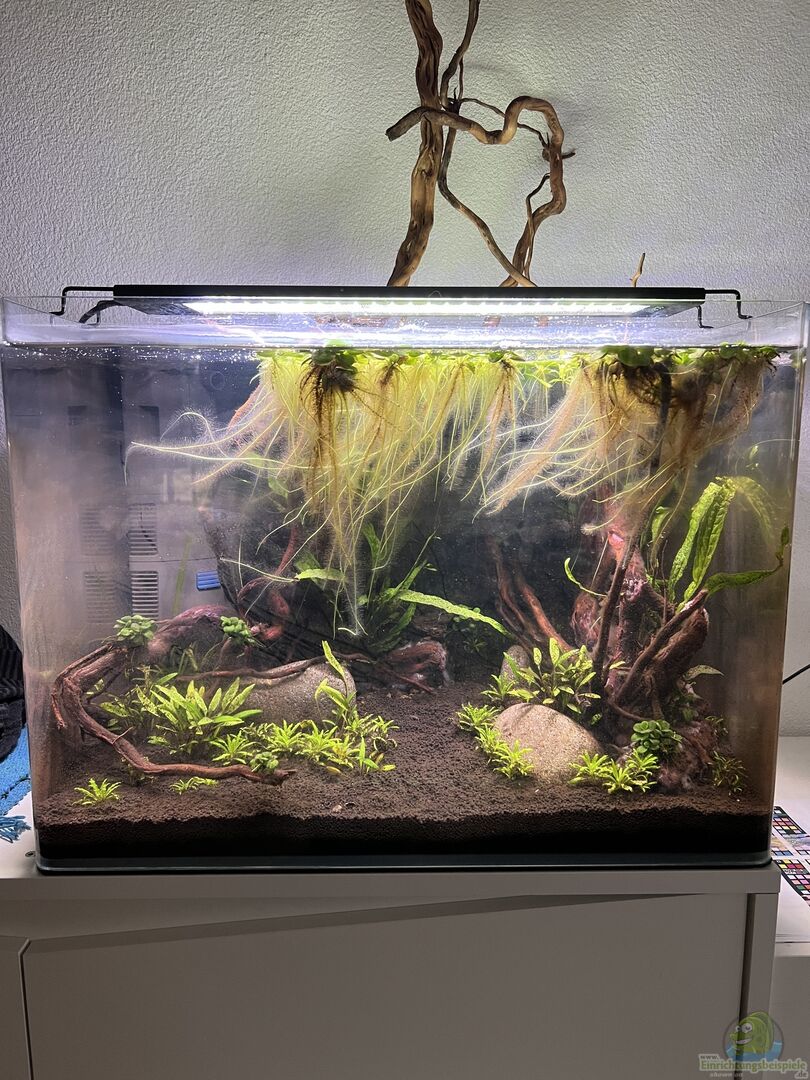 Weissglas-Becken von Dennerle (Nano Tank 70l) wird ohne GlasAbdeckung betrieben, das Holz-Hardscape (Wurzel) von Amtra Dragon Skin steht oben einige cm heraus. Als Schattenspender dient eine Schwimmpflanzendecke Schwarze selbstklebende Rückwandfolie Die Einrichtung selbst wurde nicht mit Fotos begleitet, da mein erstes Becken
