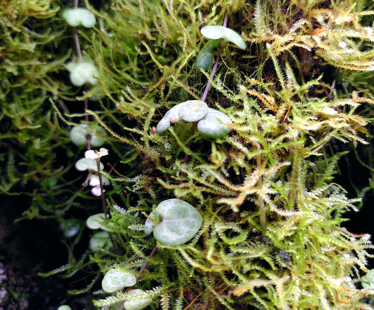 Submers: Anubia sp. Emers: Anubia sp., Ficus pumila, Grünlilien, div. Moose, Ceropegia woodii