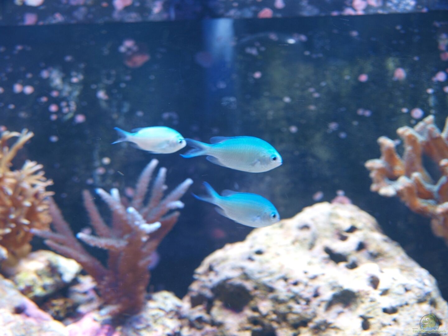 Fische: 5 * Chromis viridis (grünes Schwalbenschwänzchen) 1 * Nemateleotris decora (Dekor Schwertgrundel) 2 * Amphiprion ocellaris (Falscher Clown Anemonenfisch) 1 * Zebrasoma flavescens (Zitronenflossen-Doktorfisch Hawaii Doktor) Wirbellose: 1 * Fromia nodosa - Knotiger Seestern 1 * Tripneustes gratilla - Pfaffenhut-Seeigel 1 * Lysmata amboinensis - Wei??bandputzergarnele diverse Tectus fenestratus - Turboschnecke oder Kegelschnecke sowie Einsiedler