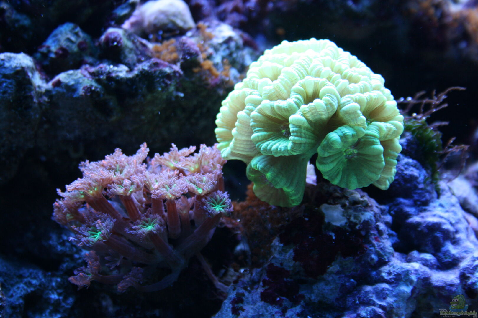 2 x Amphiprion ocellaris - Falscher Clown - Anemonenfisch 1 Synchiropus stellatus - Sternen-Mandarinfisch 3 x Calcinus laevimanus - Großscheren-Einsiedlerkrebs verschiedene Scheiben- und Krustenanemonen 1 x Entacmaea quadricolor - Blasenanemone verschiedene Acropora Caulastrea furcata Acanthastrea Montipora "Superman" Capnella imbricata ??? Keniabäumchen grün und lila Gorgonien Chalice Sinularia brassica grün