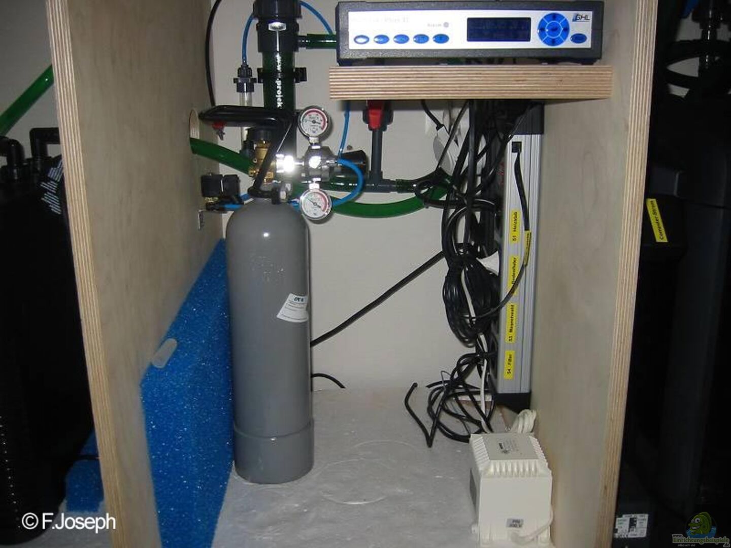 GHL-ProfiLux PlusII-Aquariencomputer zur pH-Wert-Messung, CO²-Steuerung, Lichtdimmung usw., Resun CL 450 Kühlaggregat, CO²-Komplettanlage vom projekt-aquarium mit Au??enreaktor, Bypass und 2kg Druckflasche. 200 Watt Bodenfluter, KATI um kH von ca. 6 auf 3 zu bringen, 250 Watt Heizstab. Bei Bedarf kann ein 11Watt UV-C Klärer zugeschaltet werden.