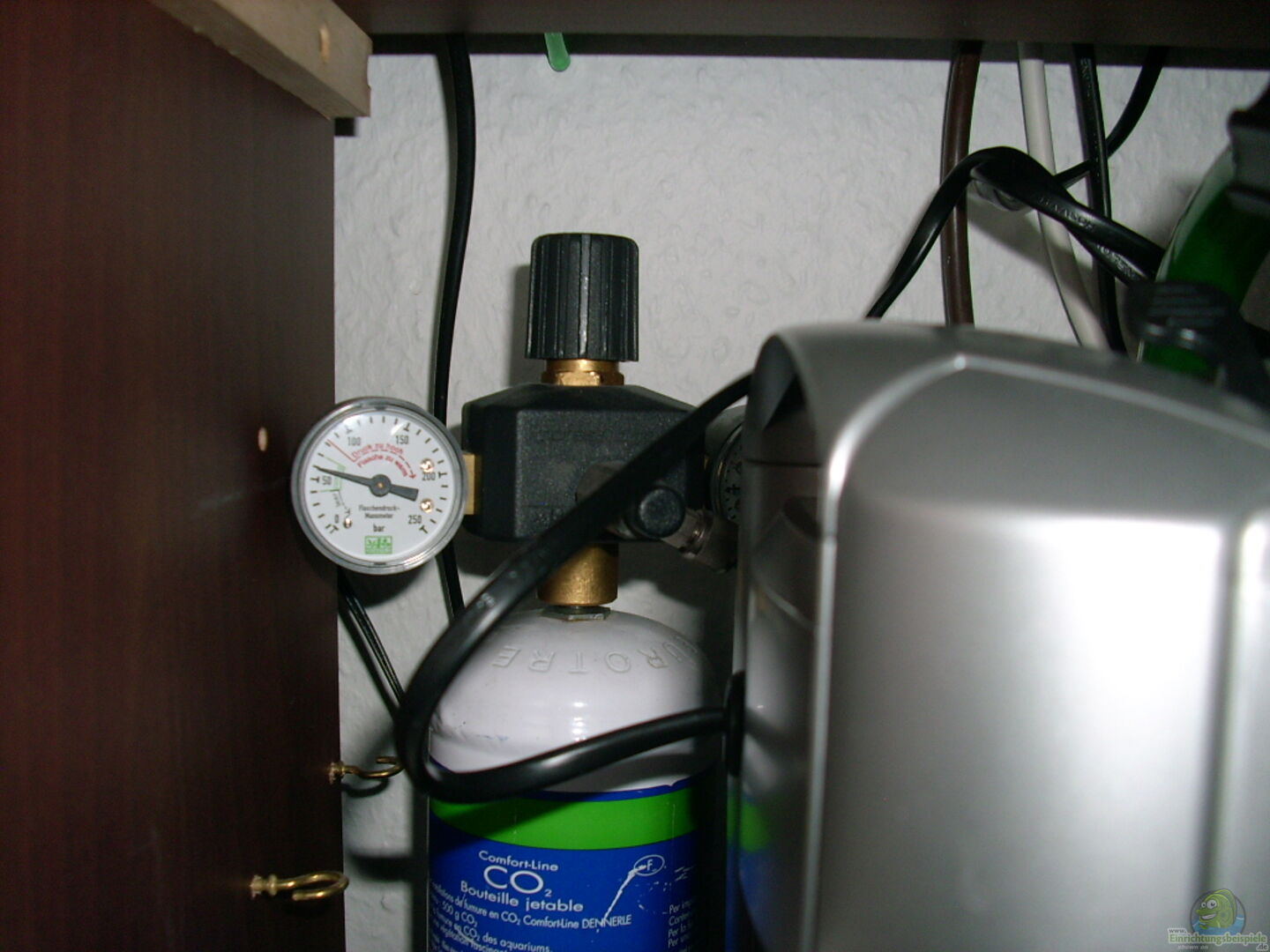 - Fluval Regelheizer (200 Watt) -> eingestellt auf 26° - Belüftungspumpe mit Sprudelstein: nicht in Betrieb (ist für Notfälle) - Marina Aqua Minder: gibt mir die genaue Temperatur an - Herkömmliches Thermometer (Glasrohr...), ich verlasse mich nie ganz auf die Technik. - 2x mechanische Zeitschaltuhr: 1x für Neonröhren/ 1x für das Mondlicht - Dennerle CO2 Anlage: Comfort Line für Aquarien bis 300 Liter 1x CO2 Einwegvorratsflasche (500 g) 1x CO2 Druckminderer 1x CO2 [...]