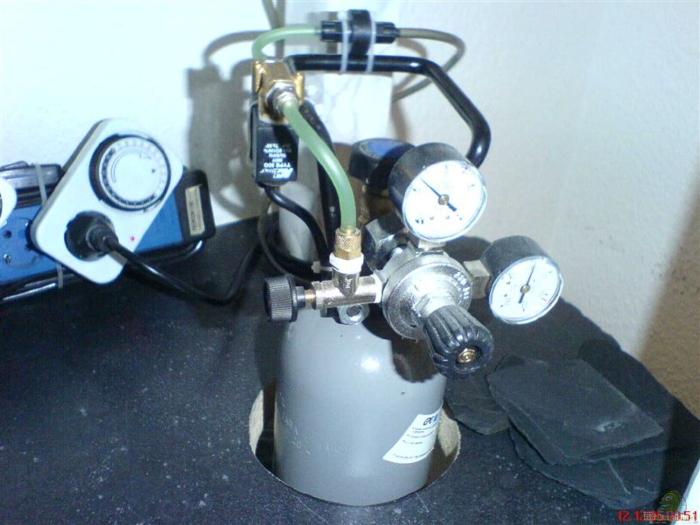 Co2 Anlage Eigenbau mit Nachtabschaltung, Druckminderer u. Rückschlagventil. Co2 Einbringung über einen Flipper Vollentsalzeranlage: 2 Säulen (Kati+Ani) mit je 5 Liter Harz. Au??er dem Flipper befindet sich im Becken keine sichtbare Technik.