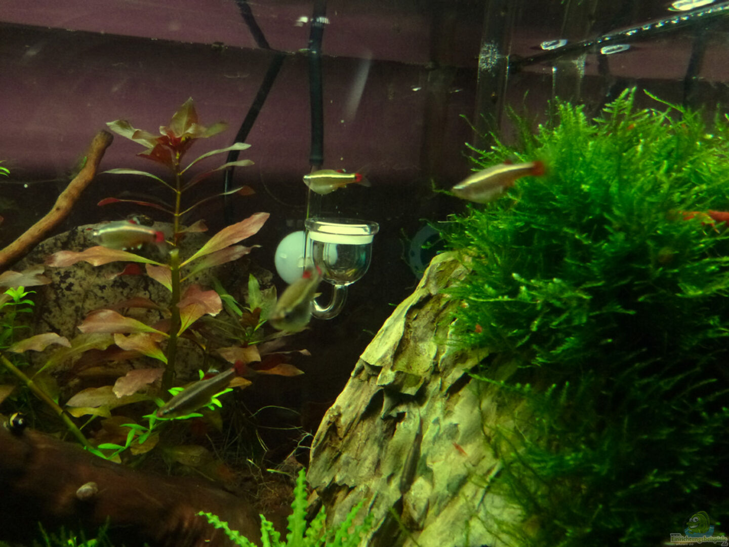 BIO CO2 von JBL über Glasdiffusor ins Becken eingebracht. Auf anraten von Jürgen habe ich den Heizer entfernt. Das Becken steht im beheizten Wohnzimmer und sollte die benötigte Temperatur auch ohne Heizer halten. Danke für den Tip Jürgen.