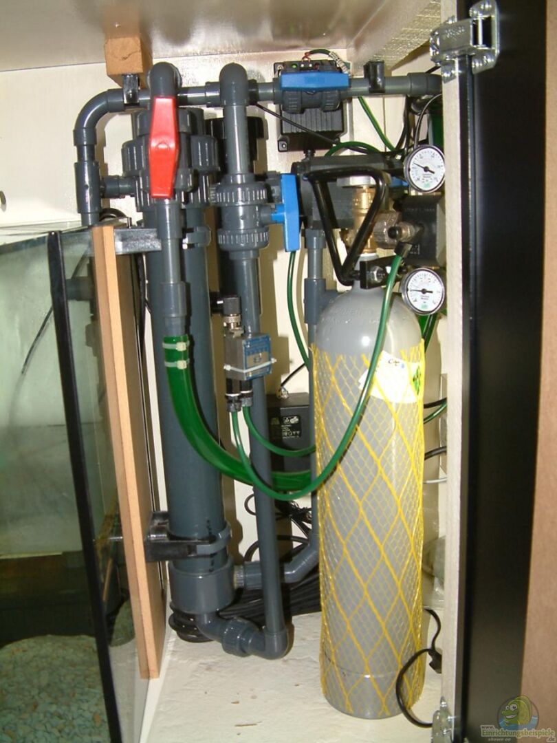 Dennerle Bodenfluter 25 Watt (z.Z. au??er Betrieb) 1 kleine Strömungspumpen im Becken in Bodennähe 300 Watt Heizstab im Filterbecken 11 Watt UV-C Lampe als Bypass (z.Z. au??er Betrieb) CO2 Düngung mit Nachtabschaltung CO2 Reaktor mit Eheim 1046 zum Einwaschen als Bypass, Eigenbau 2 Lüfter für den Sommer