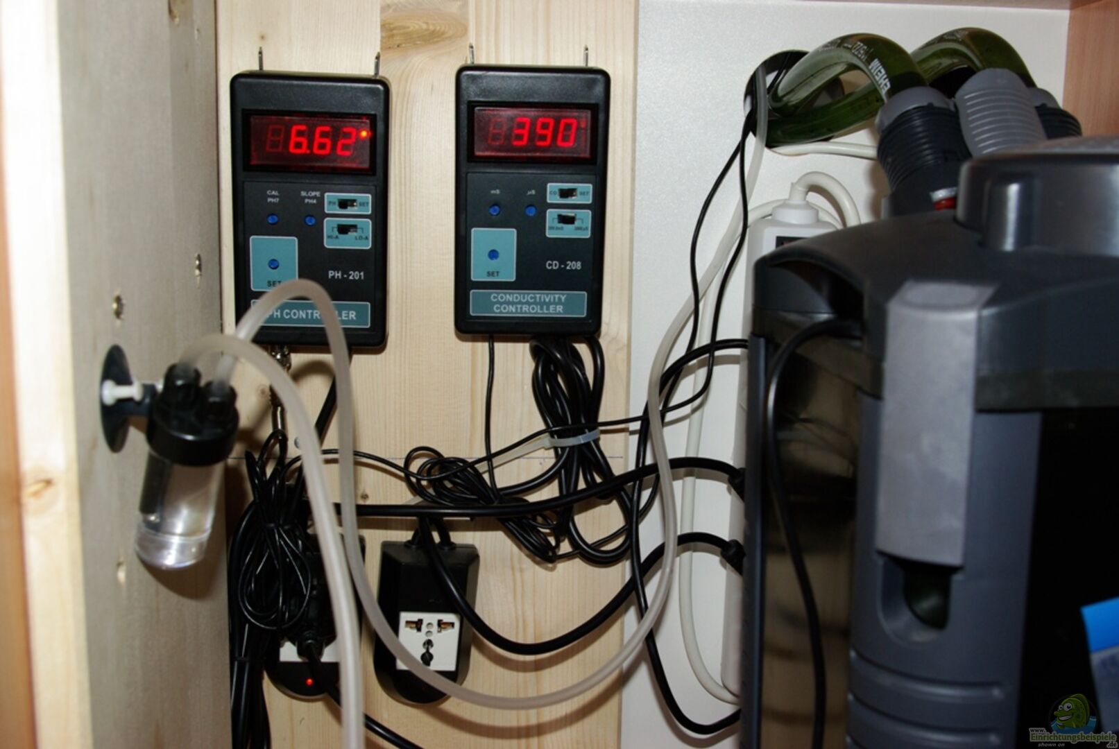 - Tunze Turbelle Nano Stream 6025( auf dem Grund hinter der Rückwand um eine Bewegung zu erhalten und keine Dreckecken zu erzeugen) -1 ph Controller (Top-Me??technik) -CO2 Anlage mit Druckminderer (JBL), 2 Manometer, 2 CO2 Flaschen (Dennerle) 2kg, CO2 Reaktor (Eheim), Rücklaufventil(JBL), 1Blasenzähler (JBL) -1 Leitwertcontroller (Top-Me??technik) -Osmoseanlage mit Druckerhöhungspumpe ´direct-flow´ (ah-aquashop) 1200l/Tag -Reiser AK-1MV (Isabi) -Diodennachtlicht grün