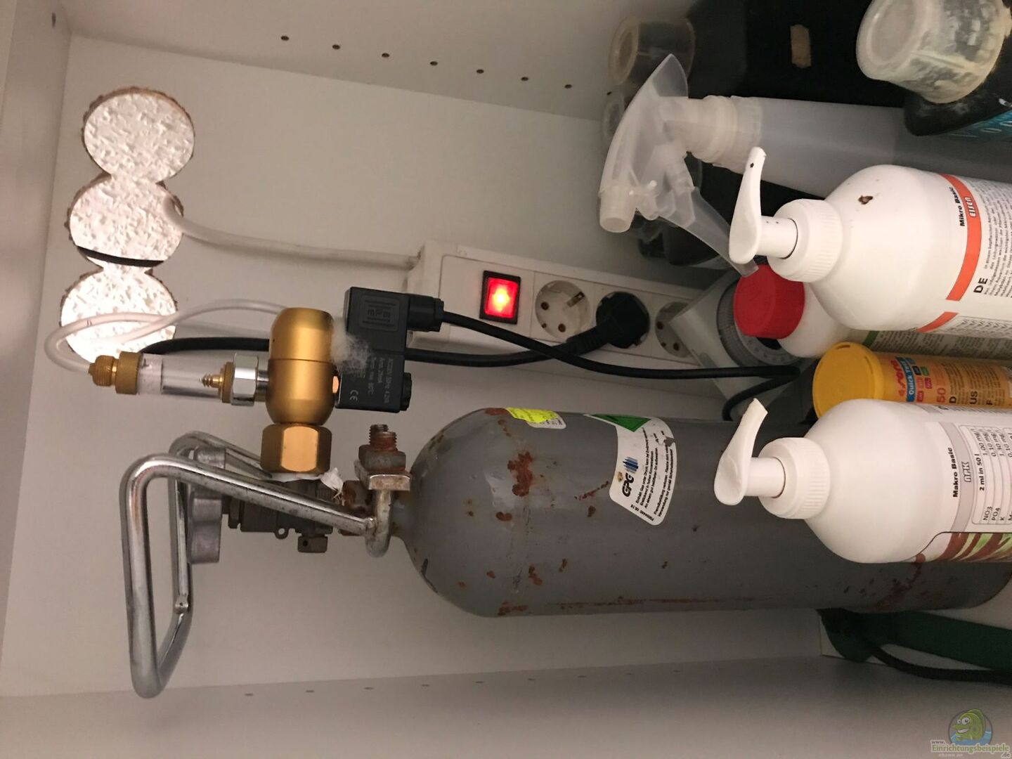Des weiteren gibt es noch eine kleine Heizung von Aquael im Becken. Eine CO2 Anlage mit Blasenzähler und Nachtabschaltung am Druckminderer und eine Diffusor im Becken. Ein Eheim Skimmer zieht die Oberfläche schön ab, da ich eine Offenes Becken betreibe.