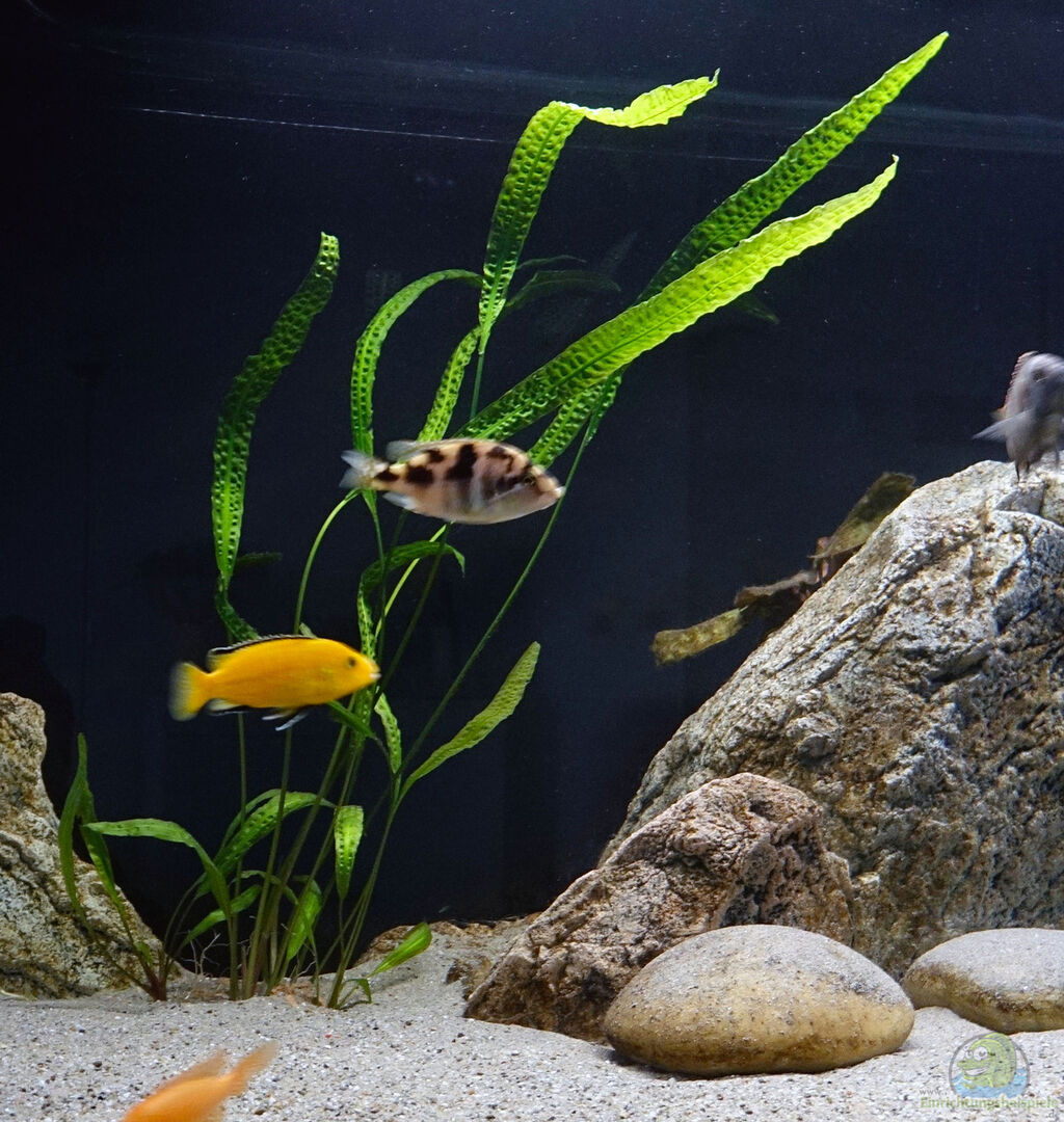 In der Mitte versuche ich einen Valisnerien-Wald wachsen zu lassen. Nur das Moorii- Männchen hat da irgendwie etwas gegen. Sonst sind in den Löchern zur durchströmung der BTN-Module Anubias eingesteckt. Das funktioniert erstaunlich gut und die Pflanzen scheinen zu gedeihen.