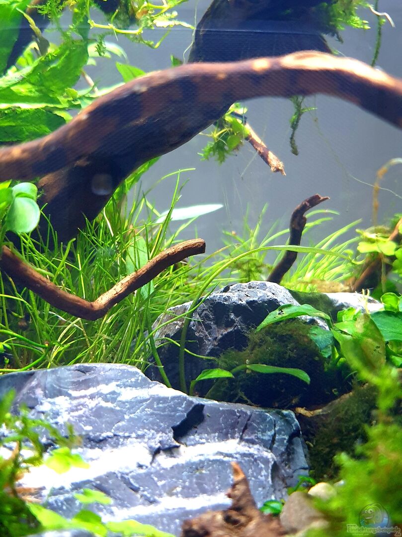 Vordergrund/Entlang der Steine: Eleocharis pusilla und Marsilea hirsuta. Auf Holz und zwischen den Steinen: Hydrocotyle cf. tripartita (wächst immer auf/mit Moosen zusammen), Bucephalandra sp. green, Javafarn "narrow" (Microsorum pteropu), Anubias Bonsai, Christmasmoss(Vesicularia montagnei) Taxiphyllum 'Spiky und vereinzelt Korallenmoos - riccardia chamedryfolia. Im Hintergrund: Hygrophila pinnatifida und im Schatten Cryptocoryne x wilisii und eine unbekannte Cryptocoryne [...]