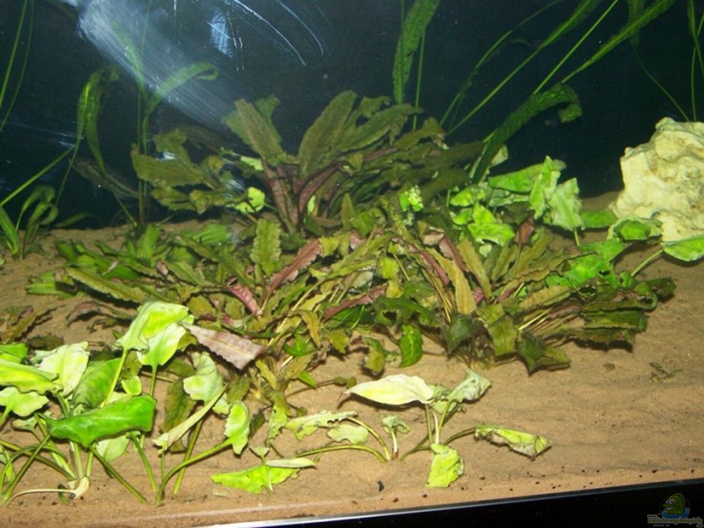 Anubias Barteri Var Nana, Anubias Barteri (gross), Cryptocoryne aponogetifolia, Cryptocoryne pontederiifolia, und 2 Cryptocoryne-Arten wo ich den Namen nicht kenne. Und eine Echinodorus. Gedüngt würd mit Lehmkugeln ´JBL die´7Kugeln´ Dazu kommen noch Monsteras und Efeututen deren Wurzeln im Rieselschacht und direkt im Aquariumwasser sind. Einige Hydropflanzen habe ich schon grossgezogen für die zukünftige Hydrowanne(Pflanzenfilter)