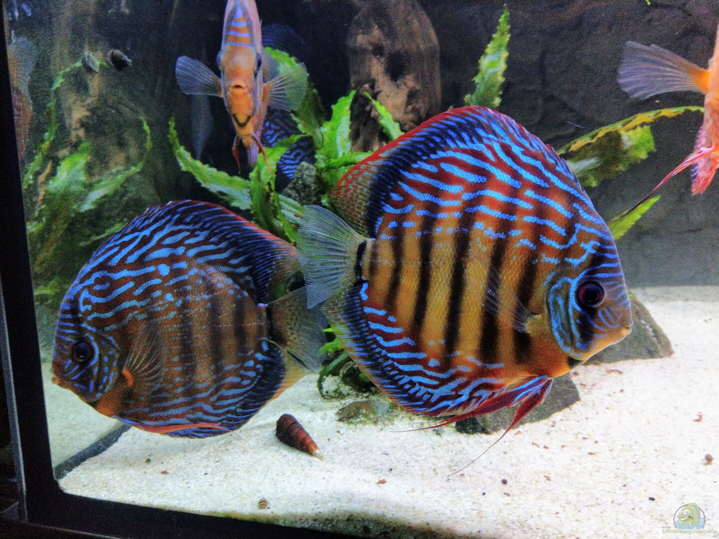 Fische: 10 Ohrengitterharnischwelse, 9 Neons 10 Corydoras Duplicareus 2 Mikrogeophagus Ramirezi Icy Blue (1M/1W) 13 Diskus Wirbellose: 5 Amanogarnelen