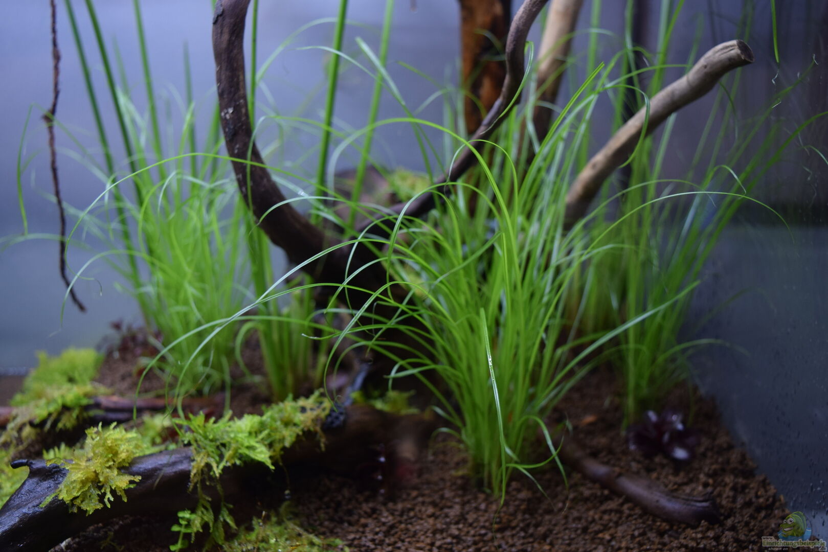 Cyperus zumula (Katzengras), Cyperus haspan, Eleocharis Xingu, emers vorgezogenes Javamoos und Leptodictyum riparium, Salvia natans, Microgramma vaccinifolia, Neoregelia Akeso, Vriesea correia aurajoi, Tillandsia festucoides,