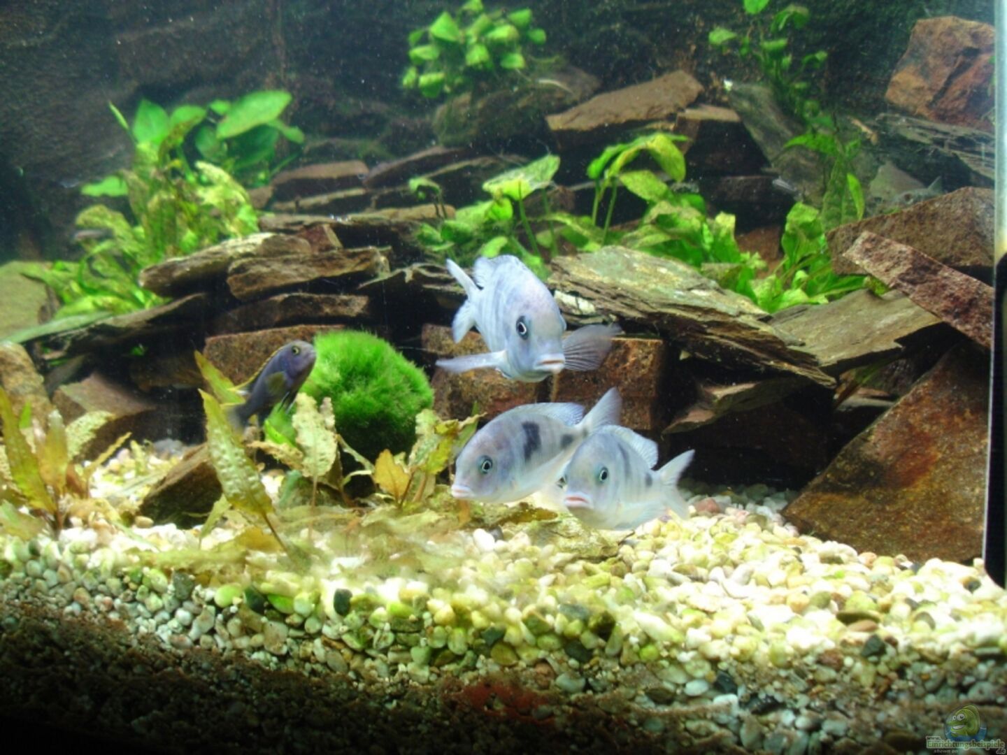1 x vermutlich( habe ihn noch nicht oft zu Gesicht bekommen): L162 Panaqolus maccus 3 x Crossocheilus siamensis (Siamesische Rüsselbarbe) 3 x cyrtocara moori (Beulenkopfmaulbrüter/Malawi-Delfin) einige: Julidochromis dickfeldi (Dickfelds Schlankcichlide) 5 x Zebra-Rennschnecke einegsetzt